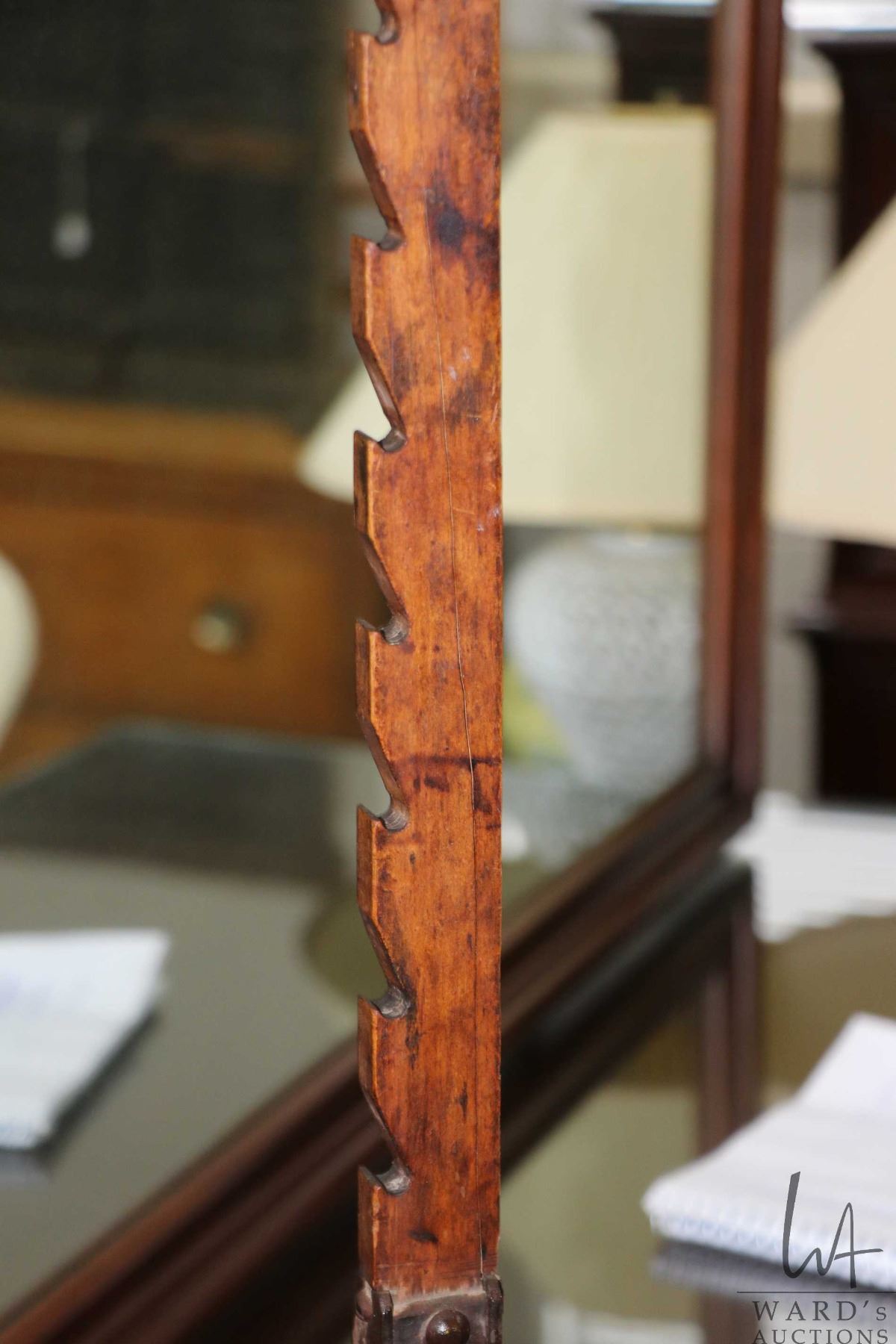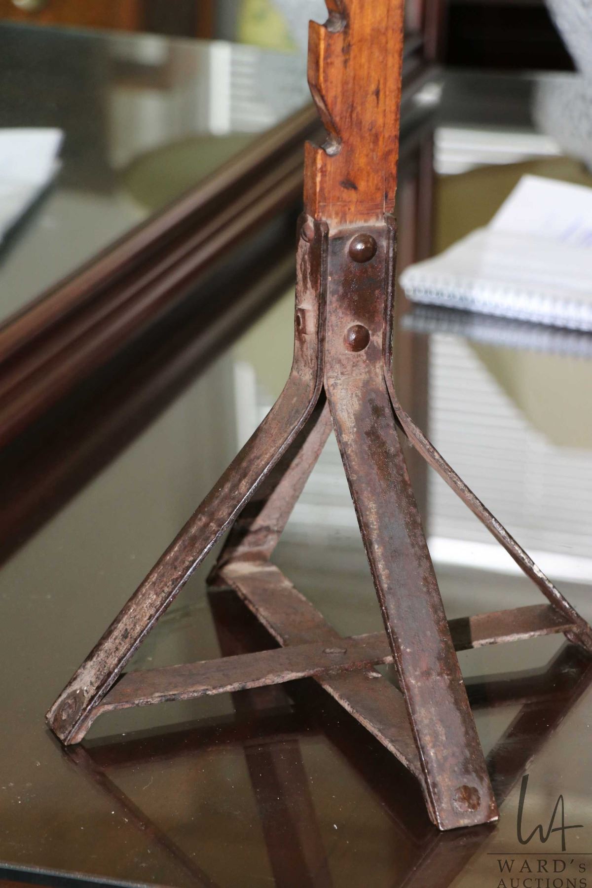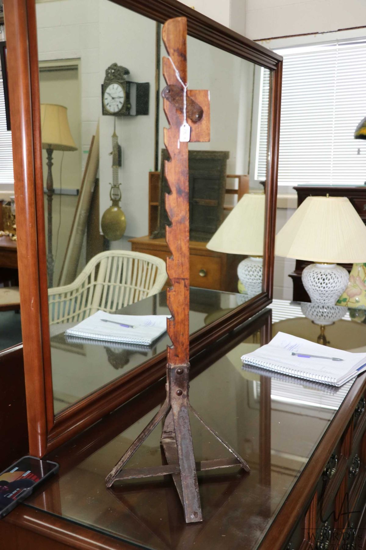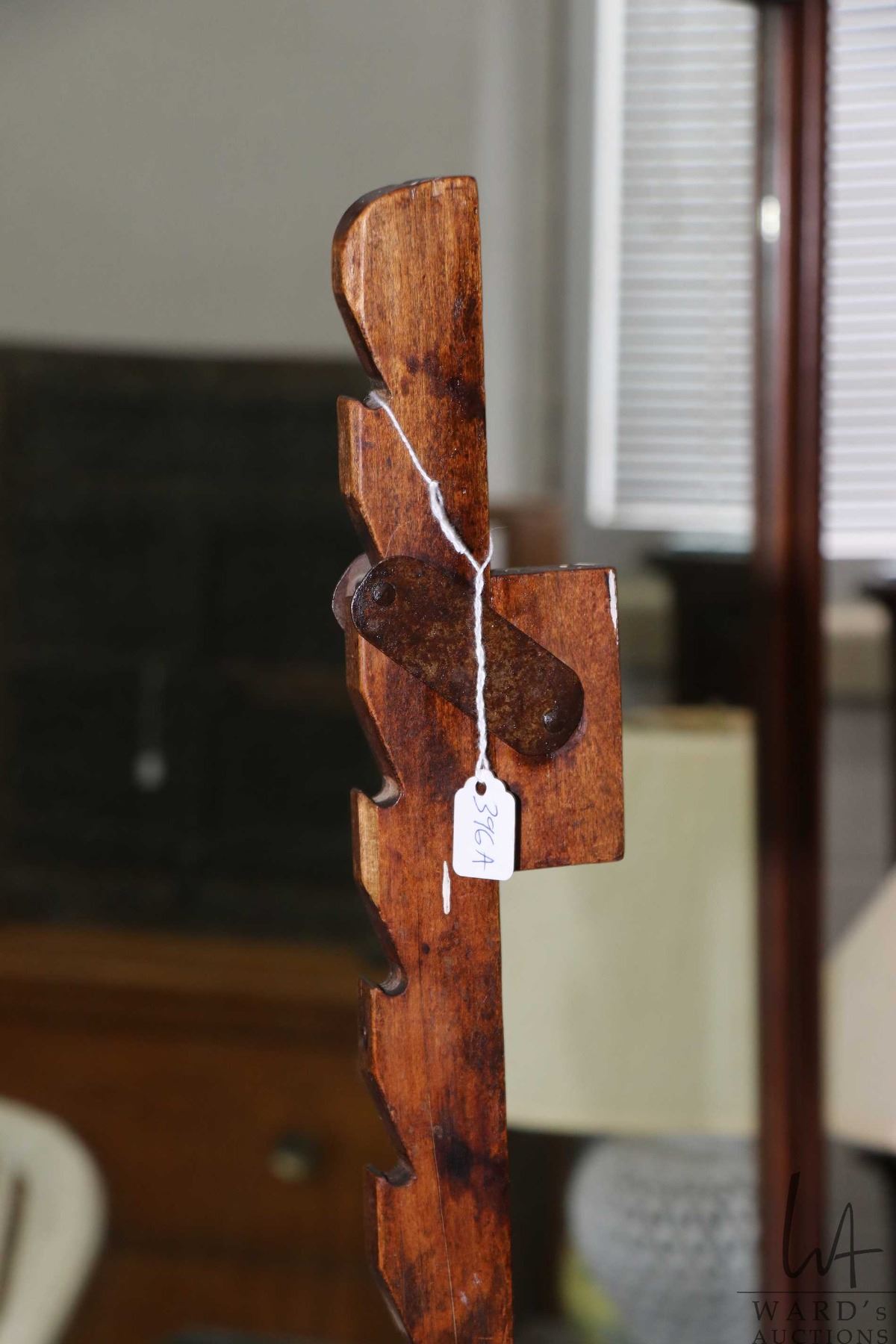Antique ratcheting wooden candlestick holder with metal base featuring hand hammered rivets, circa 1