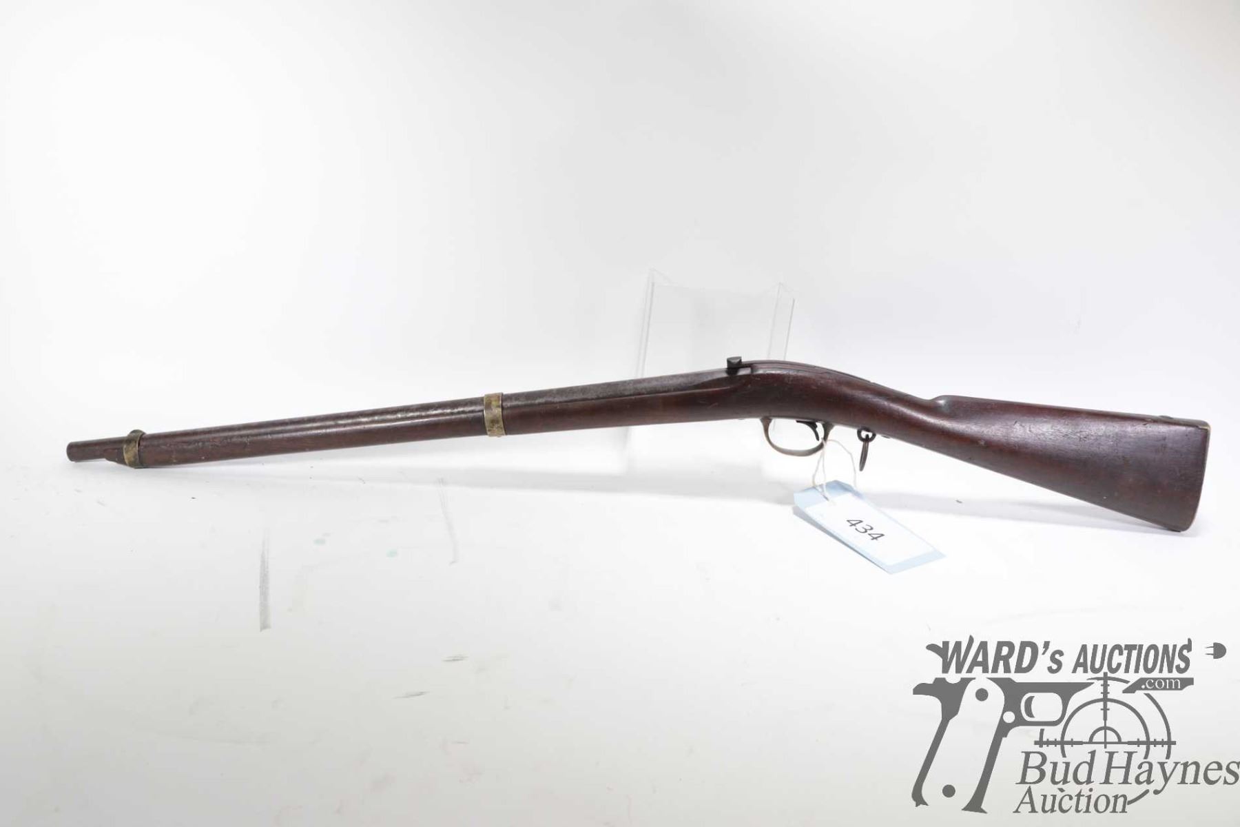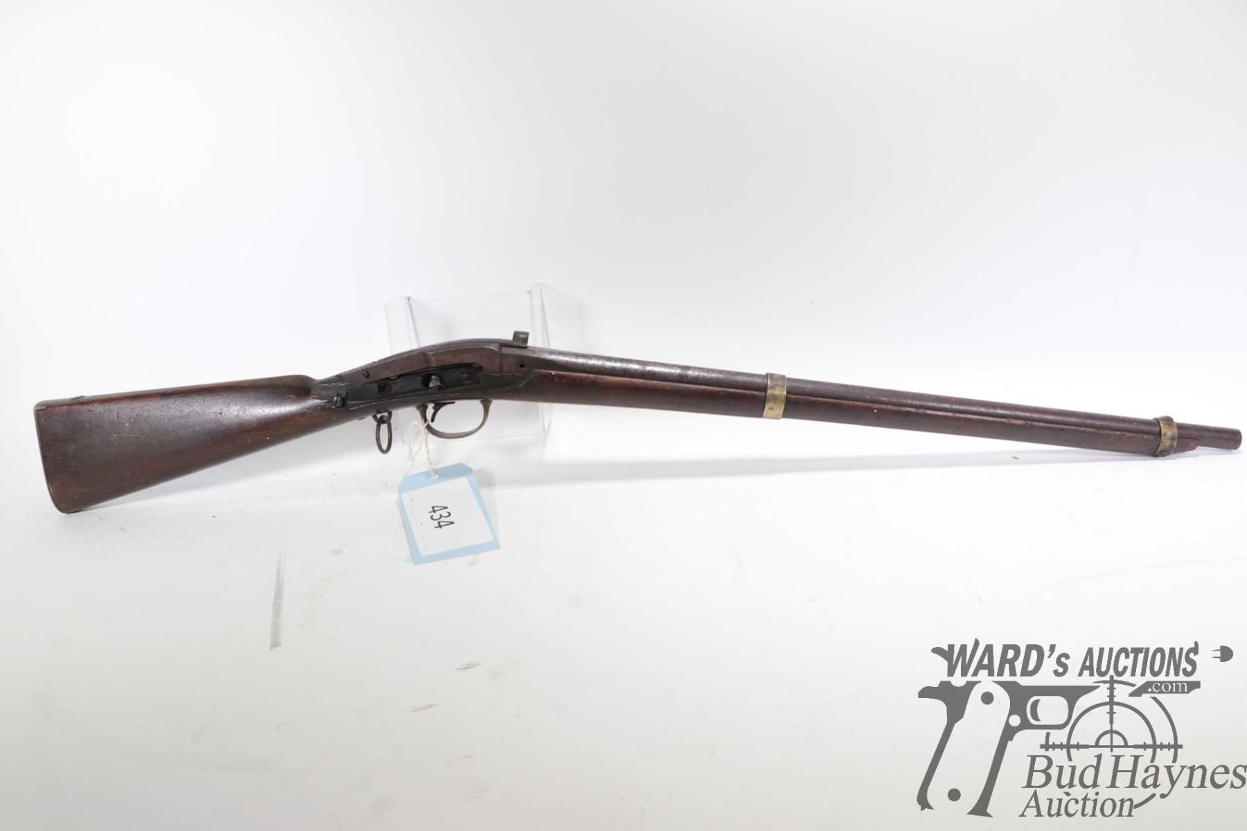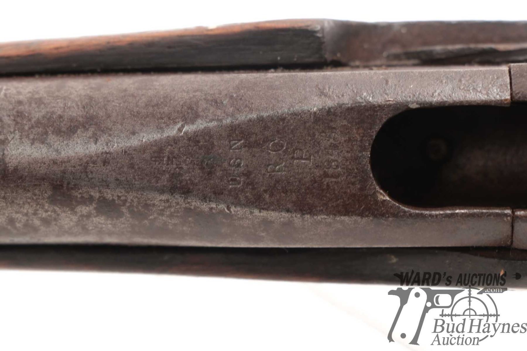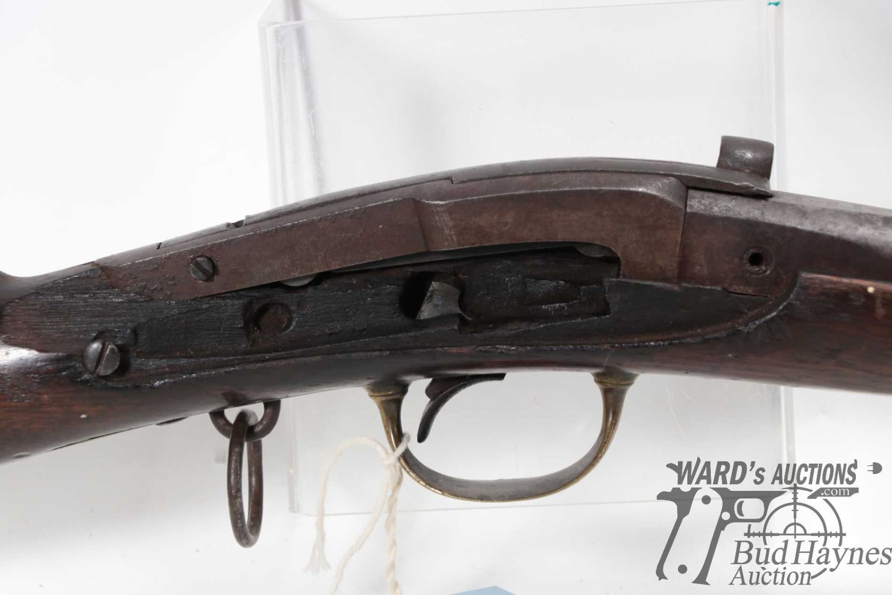 Antique rifle Ames-Jenks model Mule Ear, .54 Percussion Single shot breech loading, w/ bbl length 23" [Interesting 1845 carbine with lever opening breech block, brass trigger guard and barrel bands. Markings on top of barrel include "JENKS", "USN" (US Navy), "RC" (Sub ordnance inspector Rufus Chandler), "P" and "1845". Unfortunately side lock plate and attaching components are missing. Surface rust on all metal components. Chuck of stock missing on right side of upper tang and other use, handling and storage marks.] serial # NIL, No PAL required