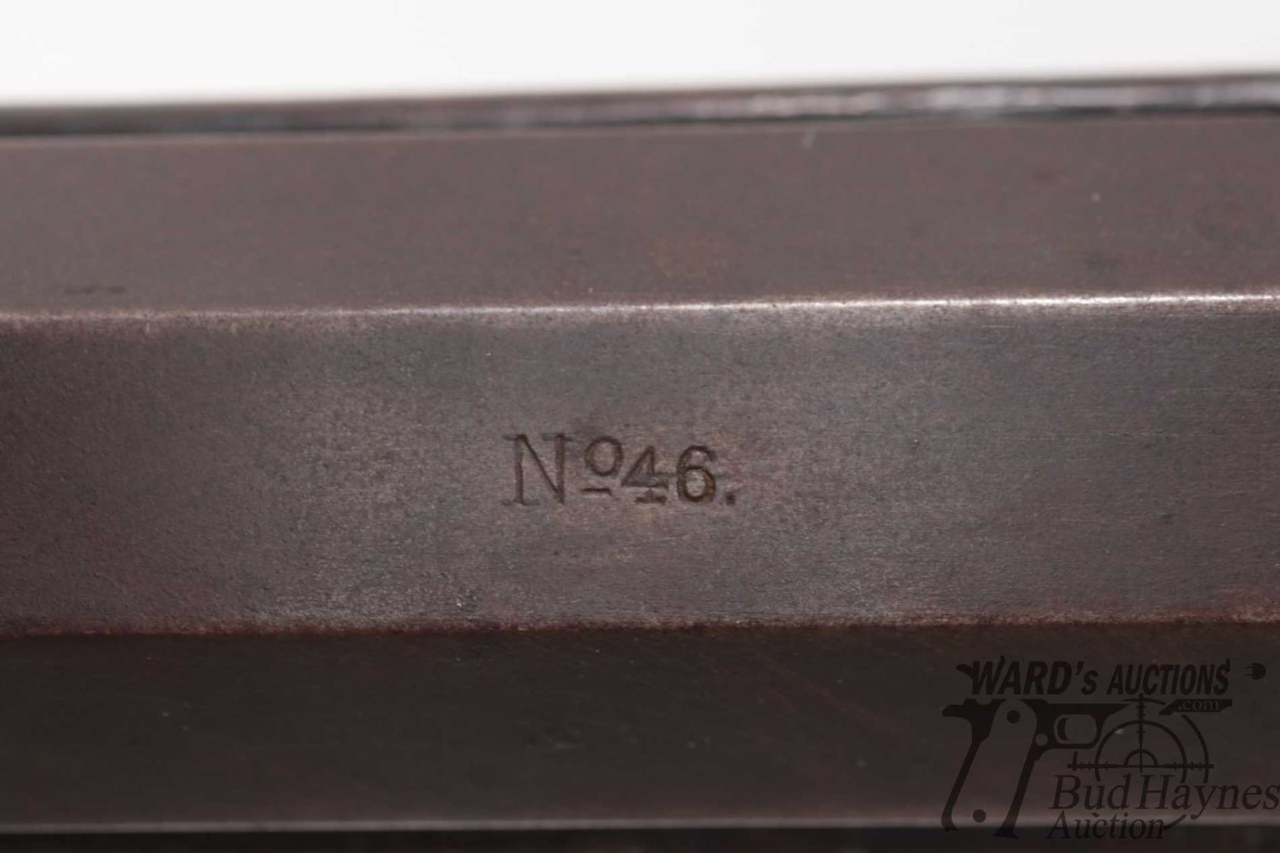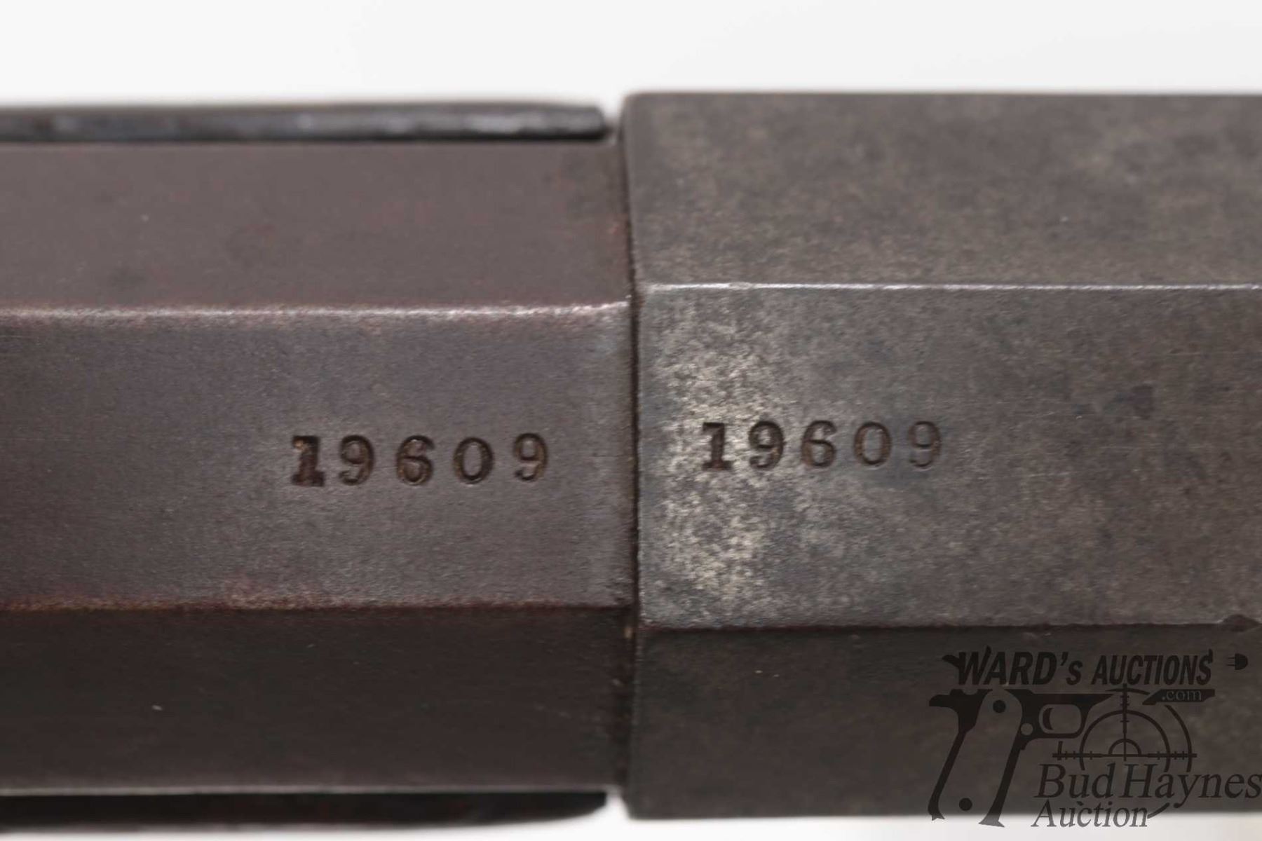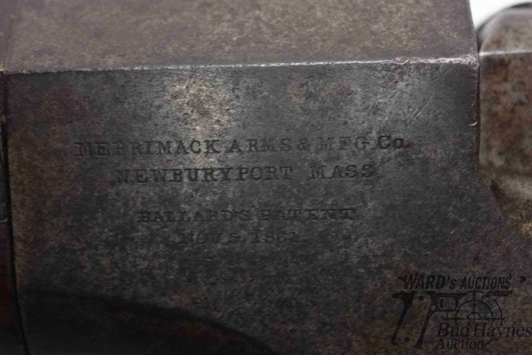 Antique rifle Ballard (Merrimack Arms & model Carbine, 46 RimFire single Shot falling block, w/ bbl length 24" [Blued heavy octagonal barrel and receiver. Fixed front and two position rear sight. Smooth straight wooden stock with curved metal butt plate. Manual extractor. Matching serial number found on barrel and receiver. Other markings include NO46 on top of barrel, MERRIMACK ARMS & MFG. CO, NEWBURY PORT MASS. etc. on left side of receiver. Wood has some cracks including right side of forend and two spots of stock where stock meets receiver. Action appears to function reasonably well. Bluing worn in use and handling areas leaving brown patina. Age appropriate use, handling and storage marks on wood and metal.] serial # 19609, PAL required. Descriptions subject to change.