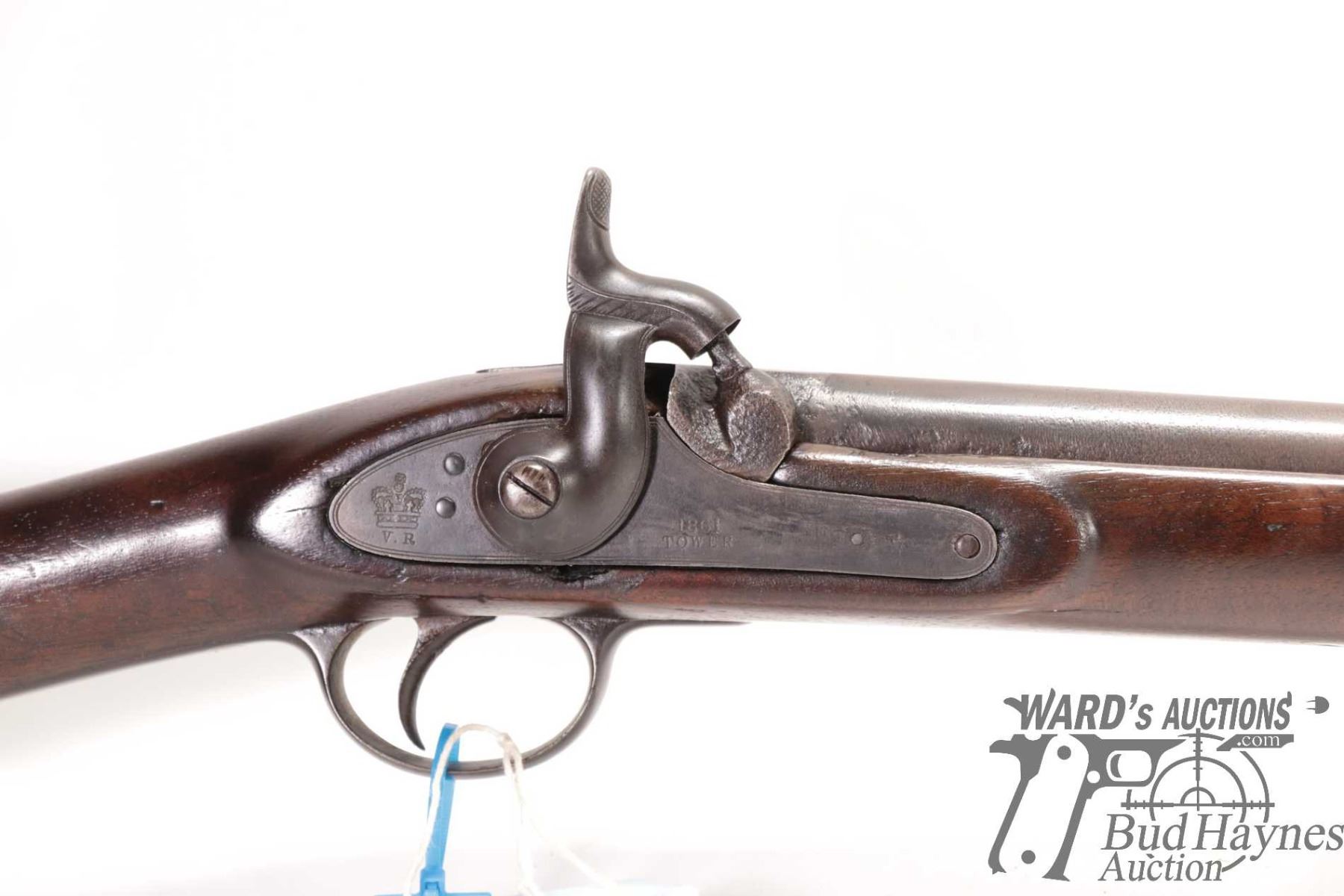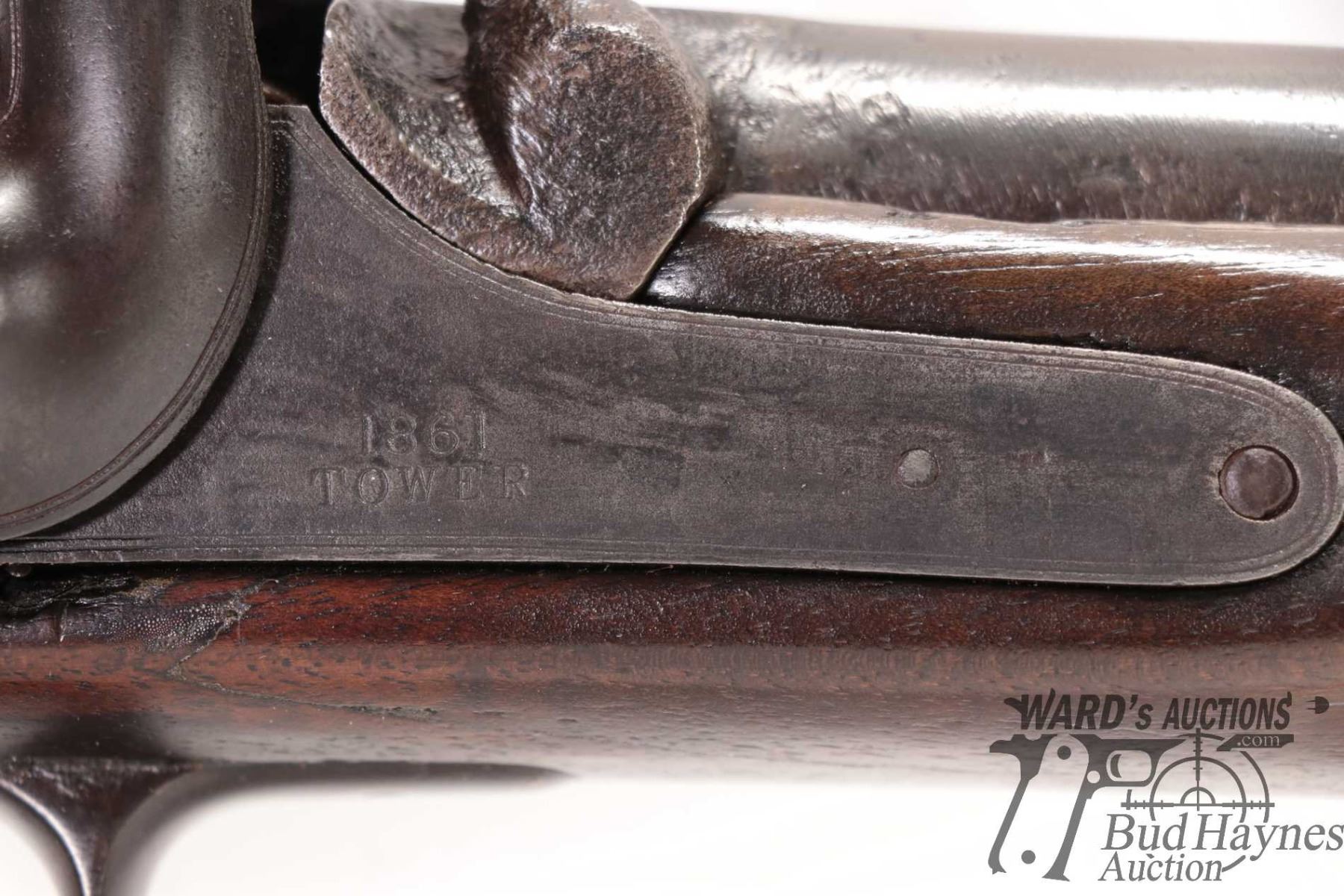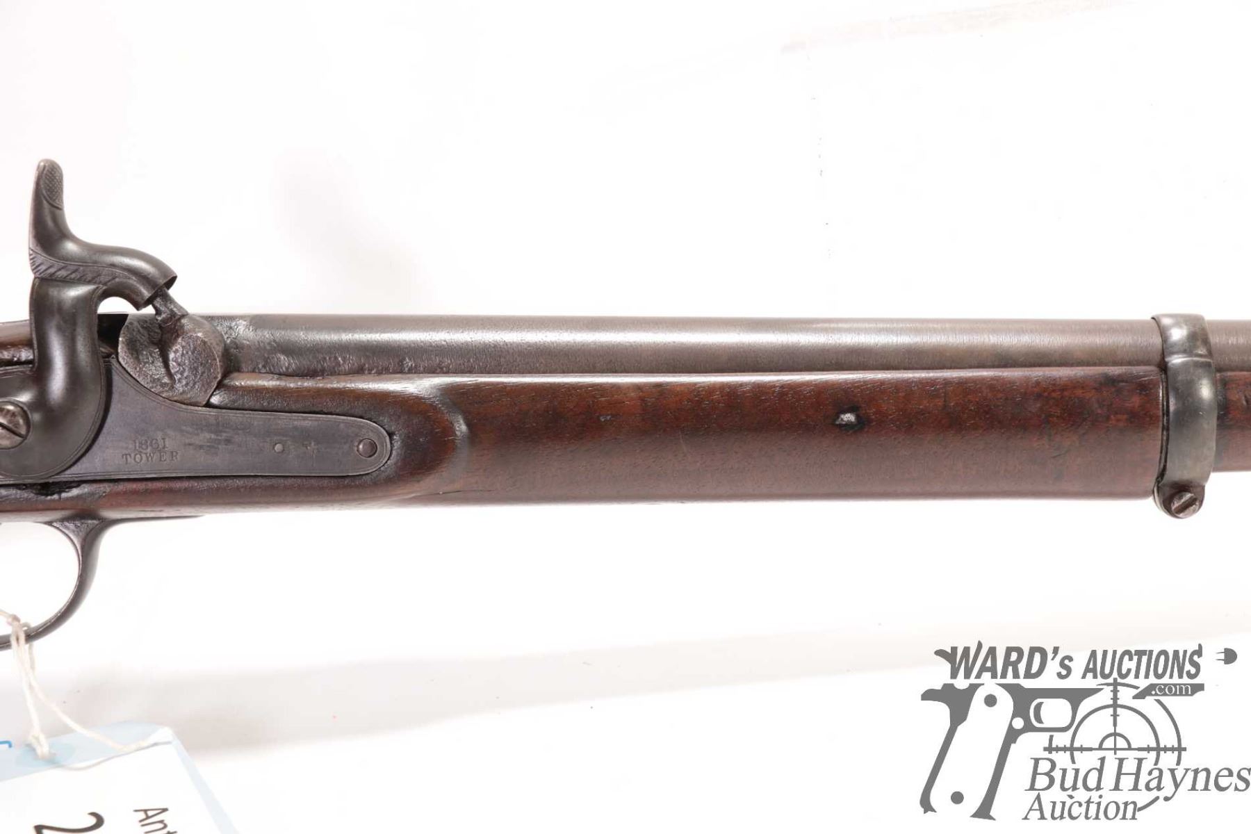 Antique rifle Enfield model Tower Rifle, .577 ( meas. .593 muzzle) Single shot Muzzle loading, w/ bbl length 32" [Blued finish. Fixed sights. Sporterized stock with metal butt plate. Marked "1861 TOWER" on lock plate. Hammer and trigger function. Metal has been re-blued with pitting under finish. Stock has been refinished with nicks and dings and other use, handling and storage marks.] serial # NIL, No PAL required