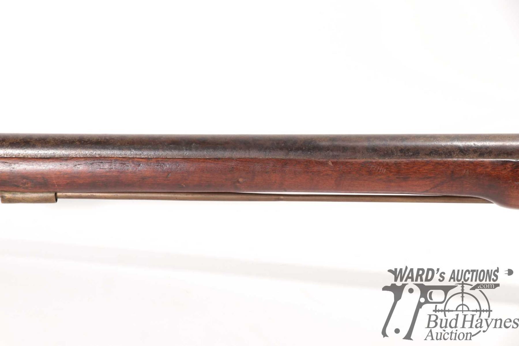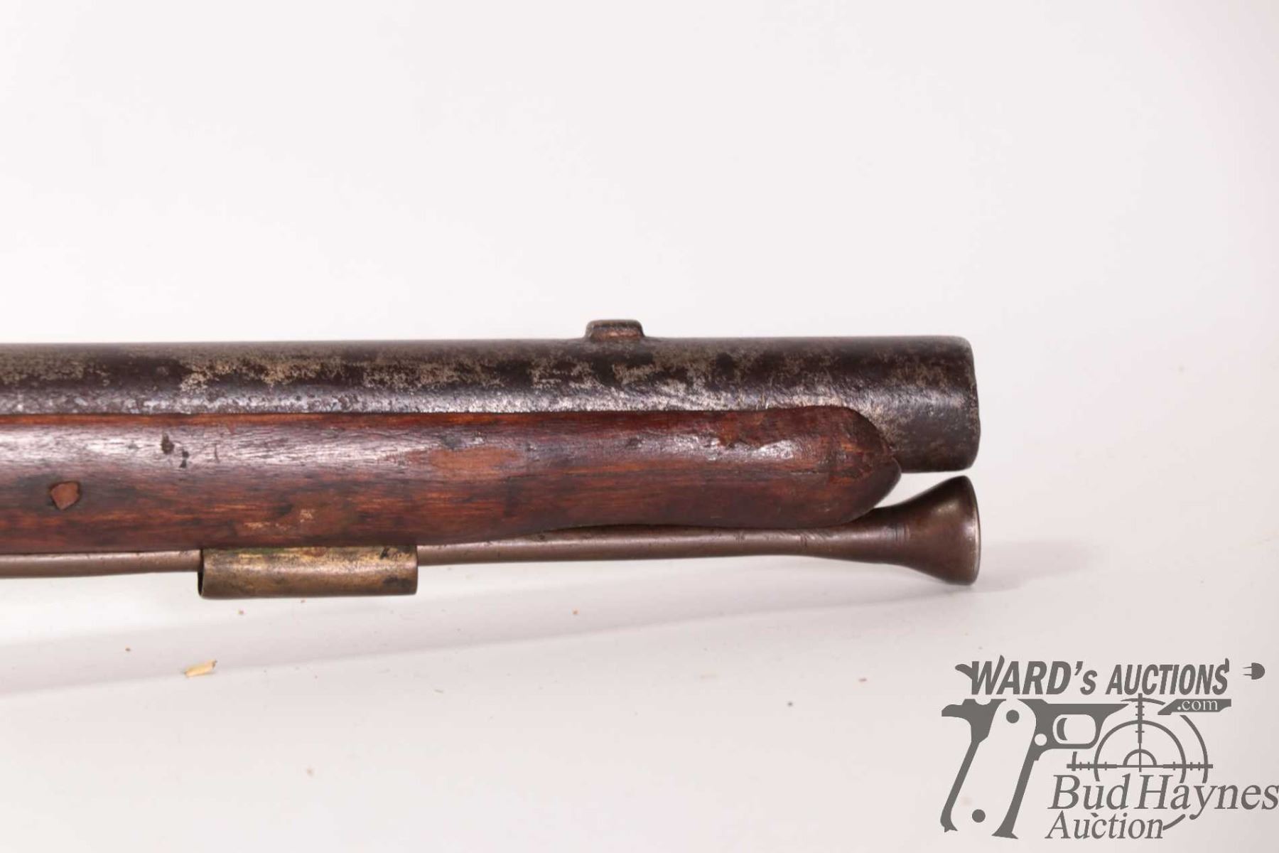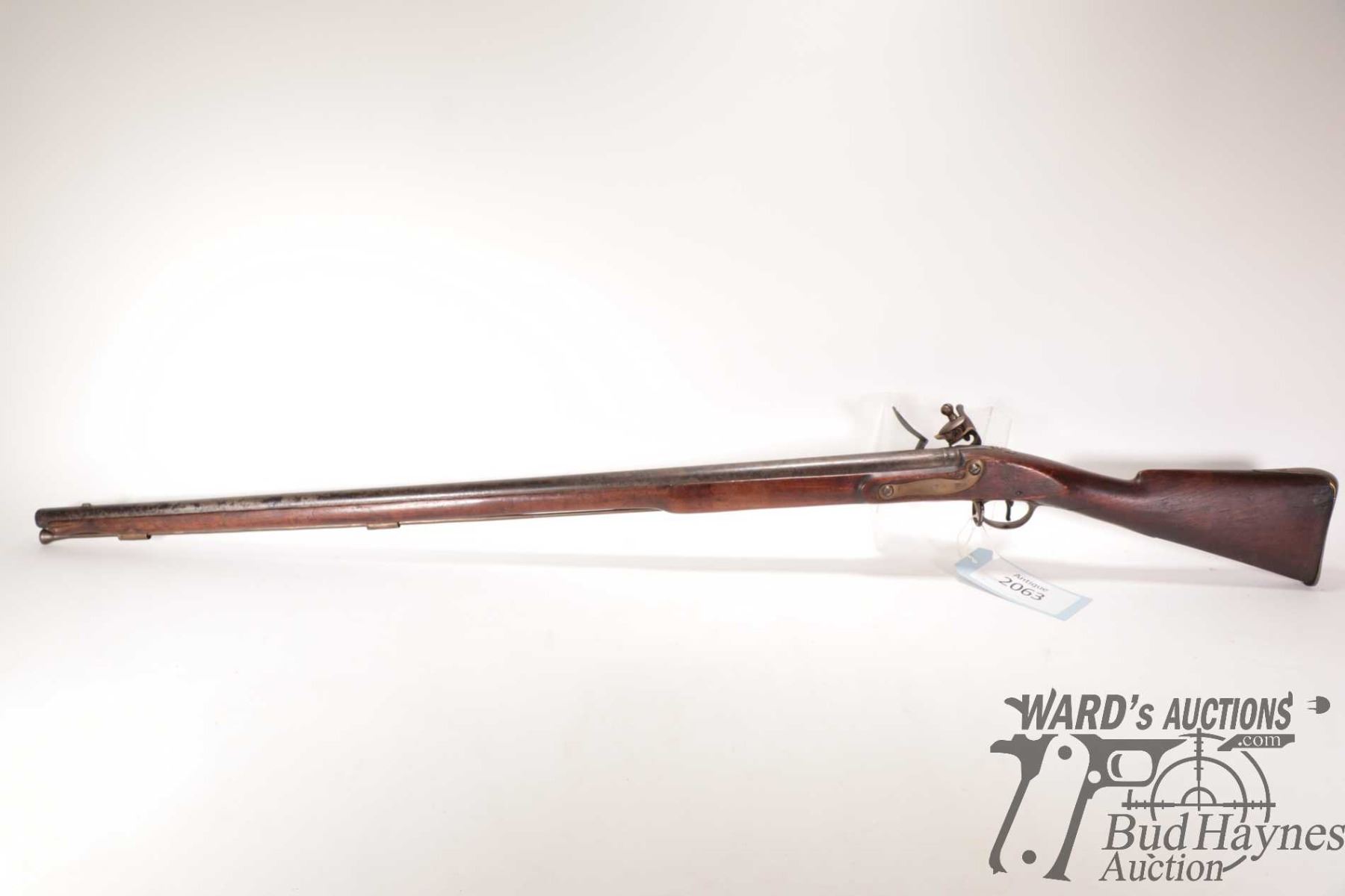 Antique rifle Tower model Brown Bess Musket, .75 Flintlock Single shot Muzzle loading, w/ bbl length 38" [Blued barrel with fixed front and no rear sight. Includes ramrod. Full length smooth barrel with brass butt plate. Markings include "Tower" and "GR" crown on lock plate etc. Action and trigger function albeit a bit stiff. Bluing worn in use and handling areas with some rust and pitting. Nicks, dings and cracks in stock plus other use, handling and storage marks.] serial # NIL, No PAL required
