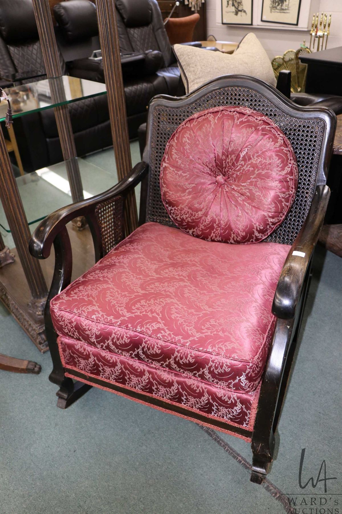 Antique rocking chair with caned back and cushioned seat, includes matching throw cushion
