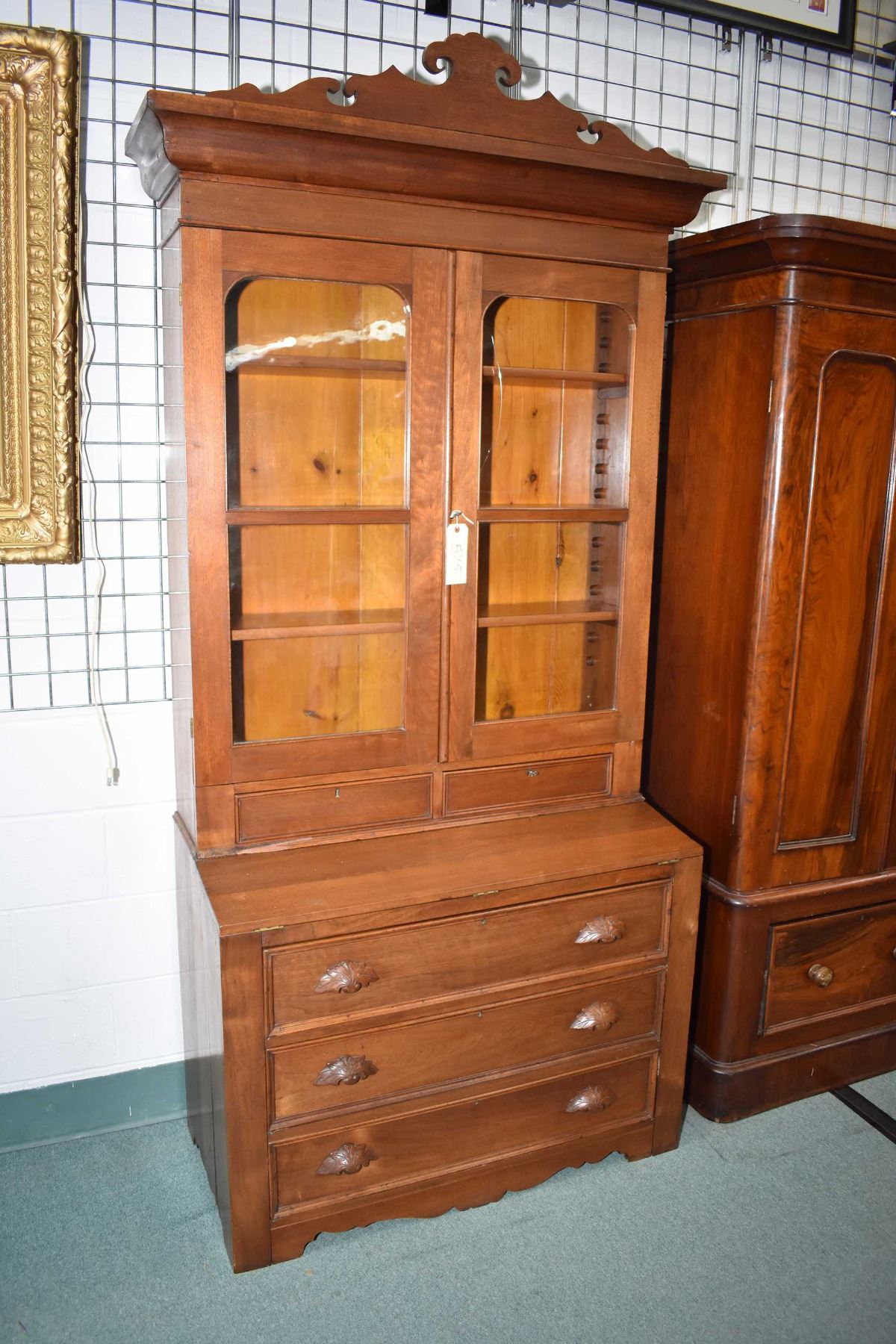 Antique secretaire with three drawer base, flip over writing surface and glazed book storage, note on pane cracked, 91" in height