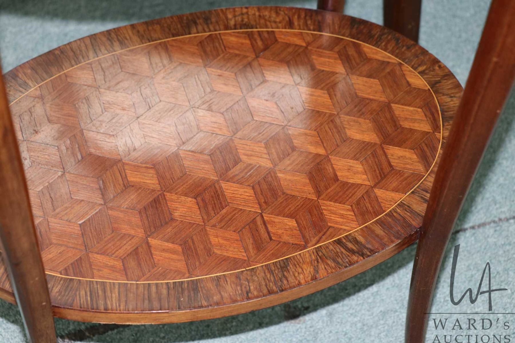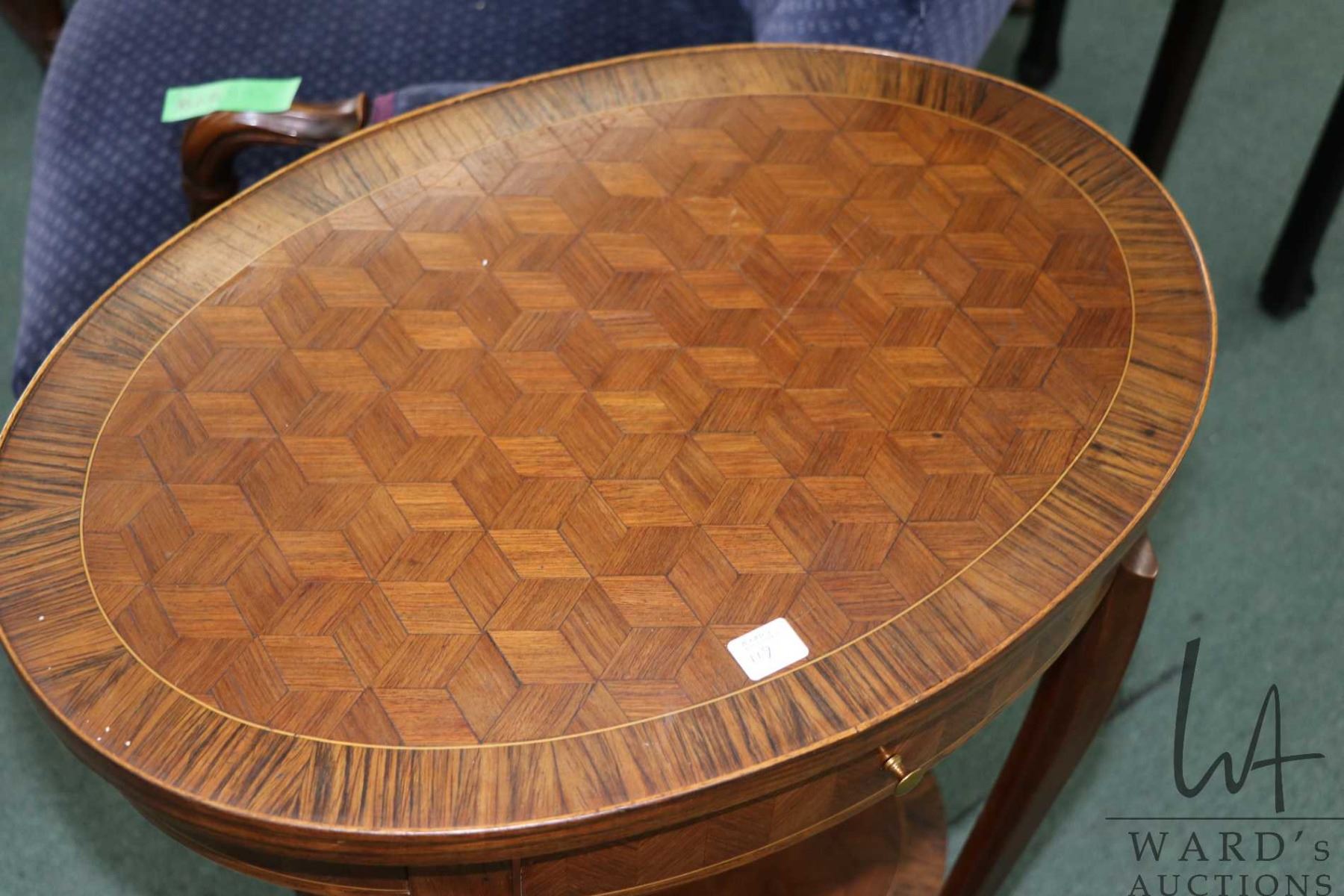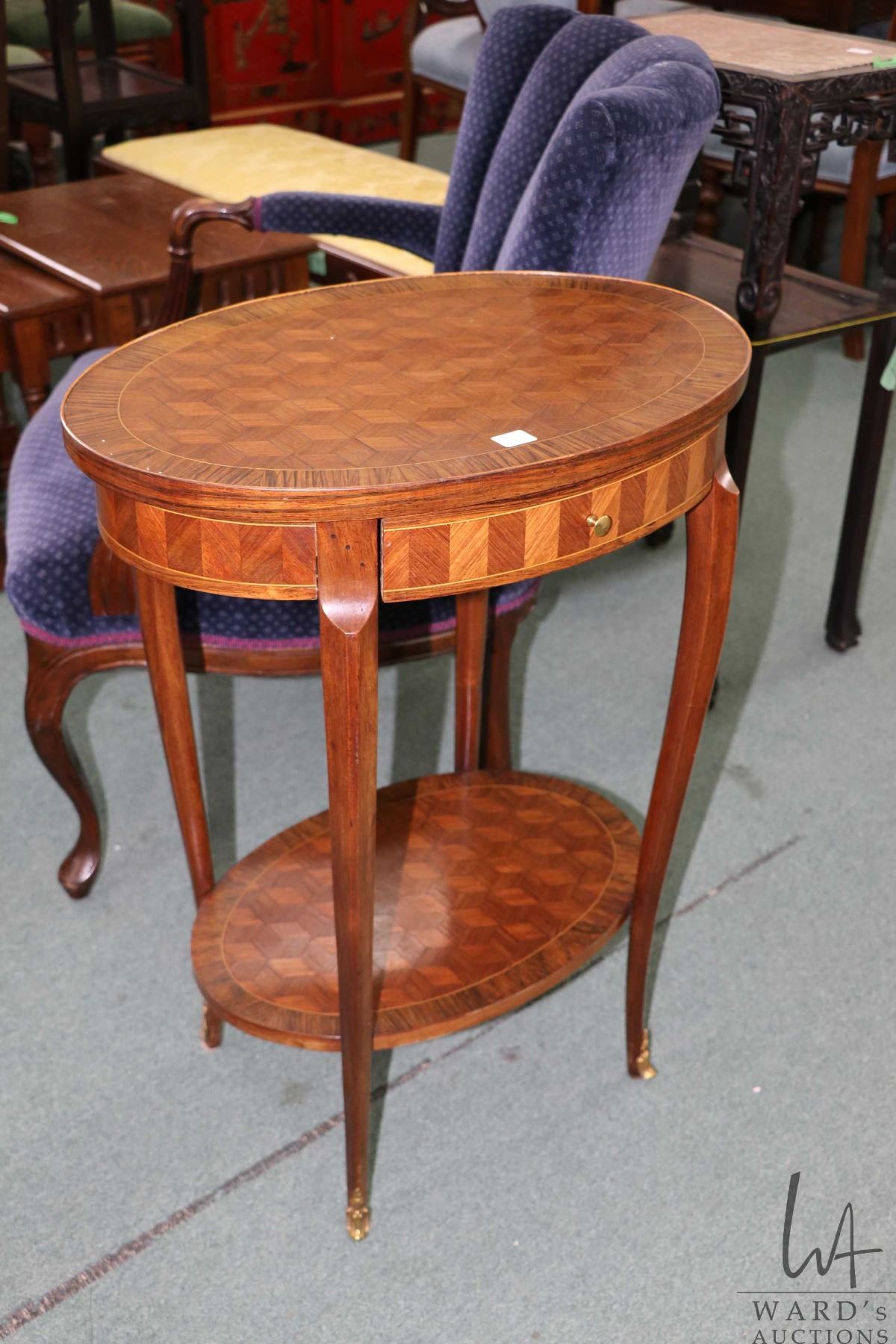 Antique side table with marquetry top and matching under shelf, single drawer and ormolu capped feet, 22" X 15" X 29" H