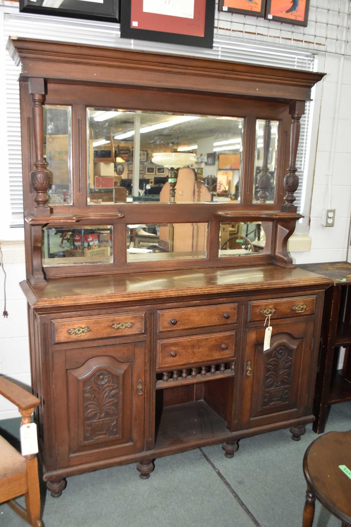 Antique sideboard with raised panel carved doors, six mirrored tall backboard with turned and carved supports