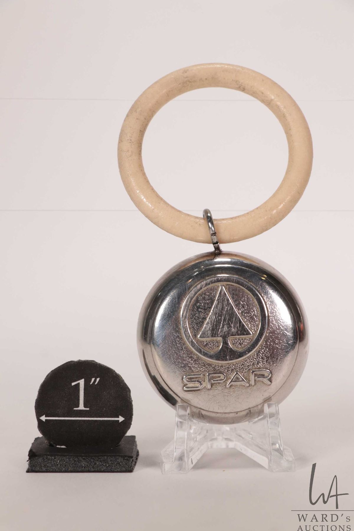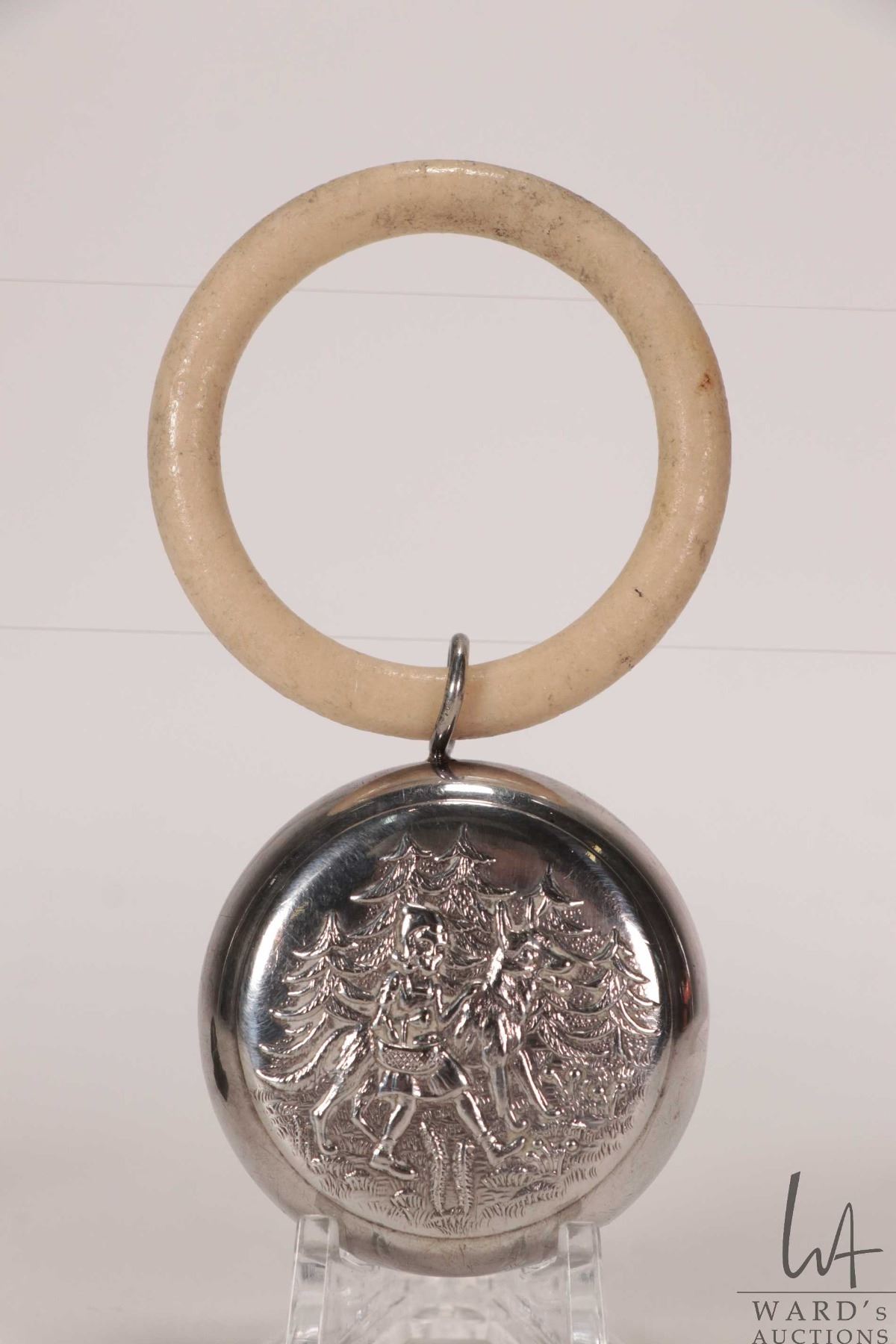 Antique silver plate Red Riding Hood motif baby toy, no marks seen