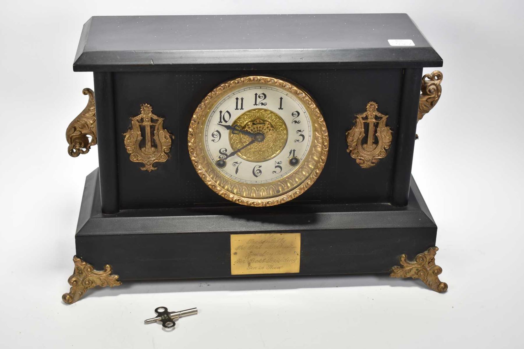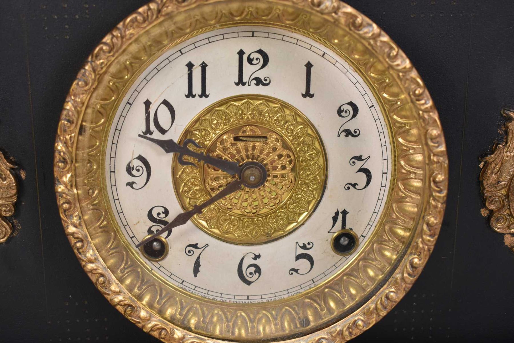 Antique simulated slate chiming mantle clock with attached ormolu style decoration manufactured by the Ingrahm Clock Co. with attached presentation plate. Working at time of cataloguing. Not Available For Shipping. Local Bidders Only