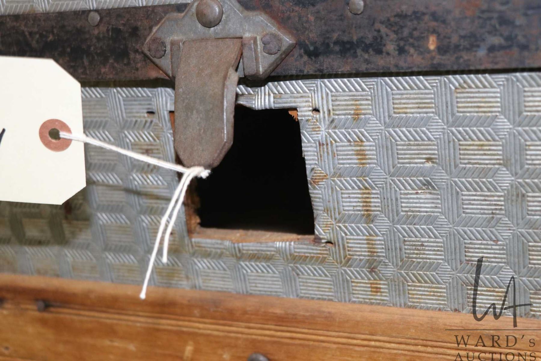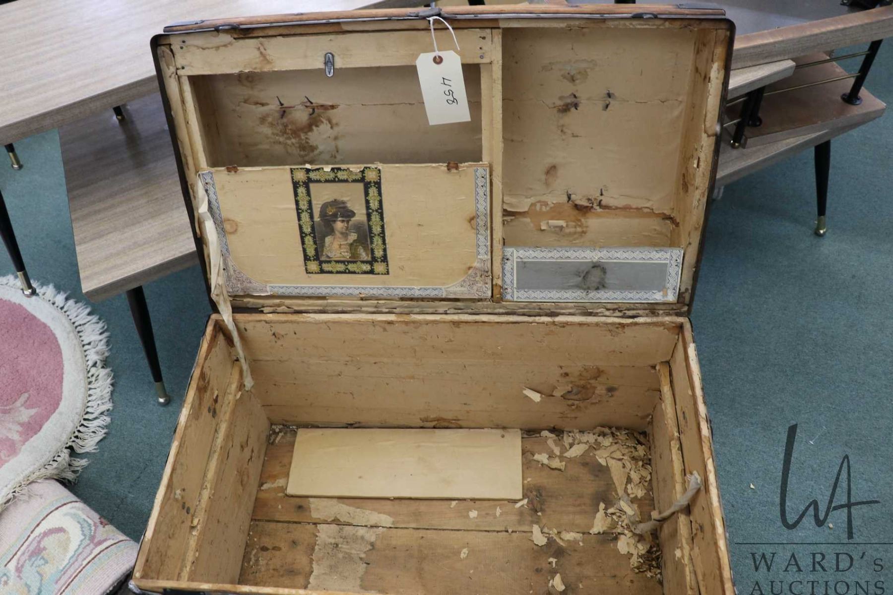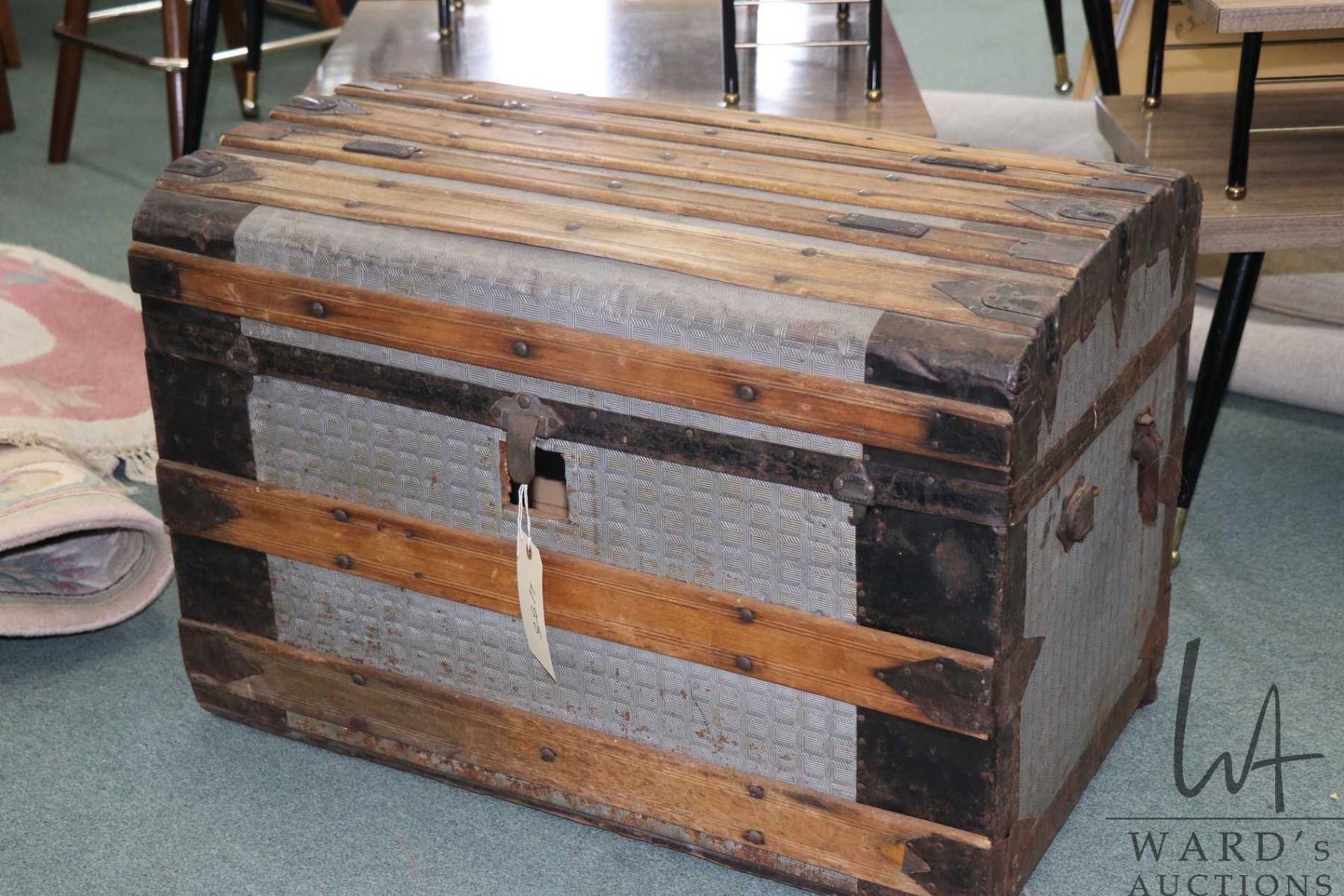 Antique steamer trunk with oak binding and protective metal panels. Meaures 22" high, 32" wide and 19" deep.