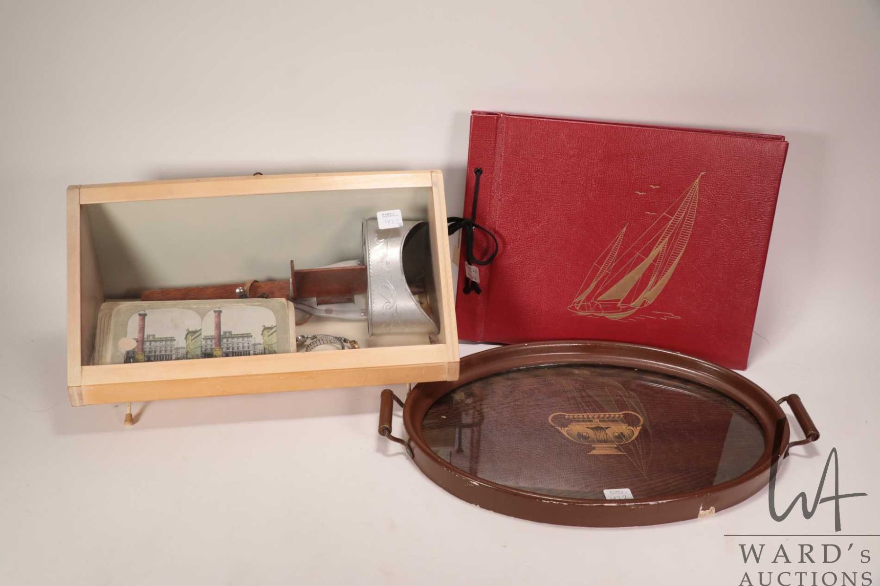 Antique stereoscope with photo cards, two ladies wrist watches, an unused photo album with original Hudson's Bay $2.50 price tag and a mid century counter top display and a double handled serving tray