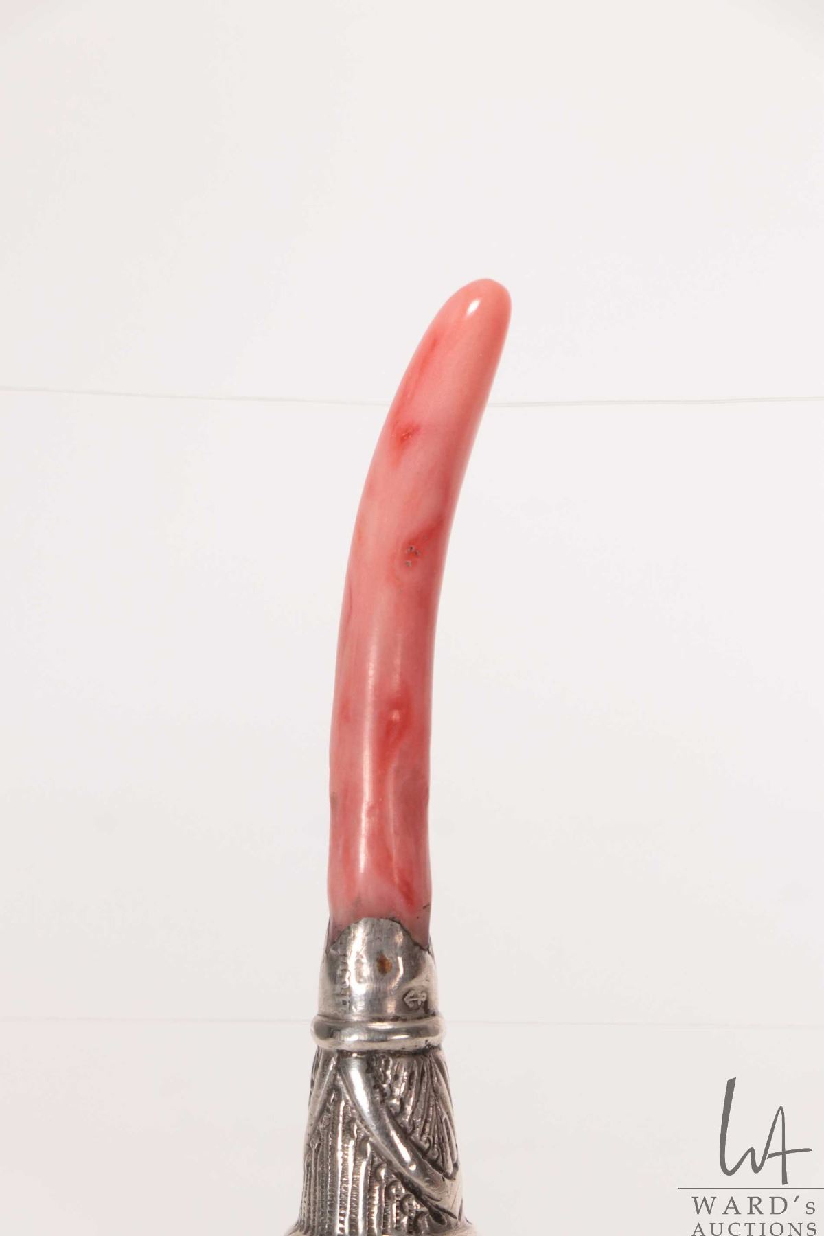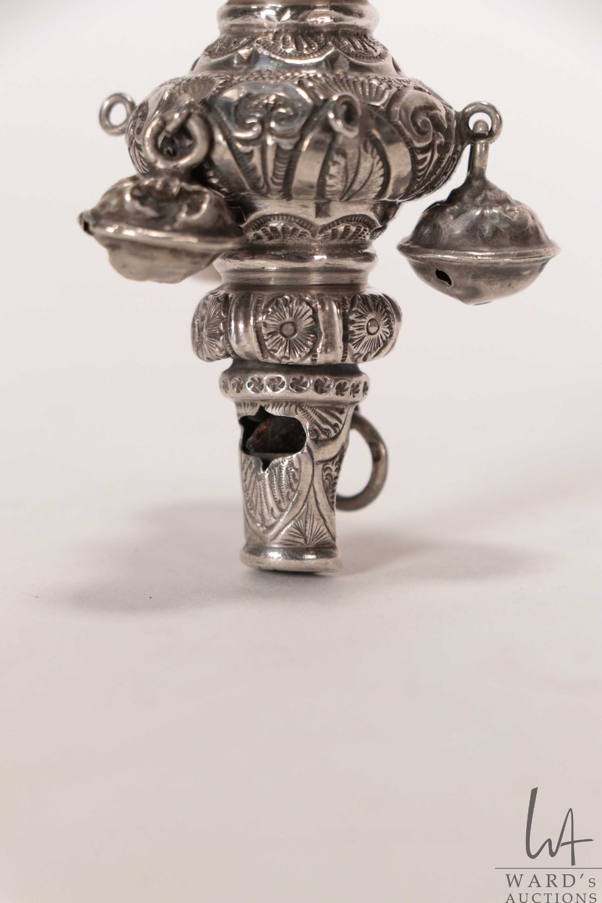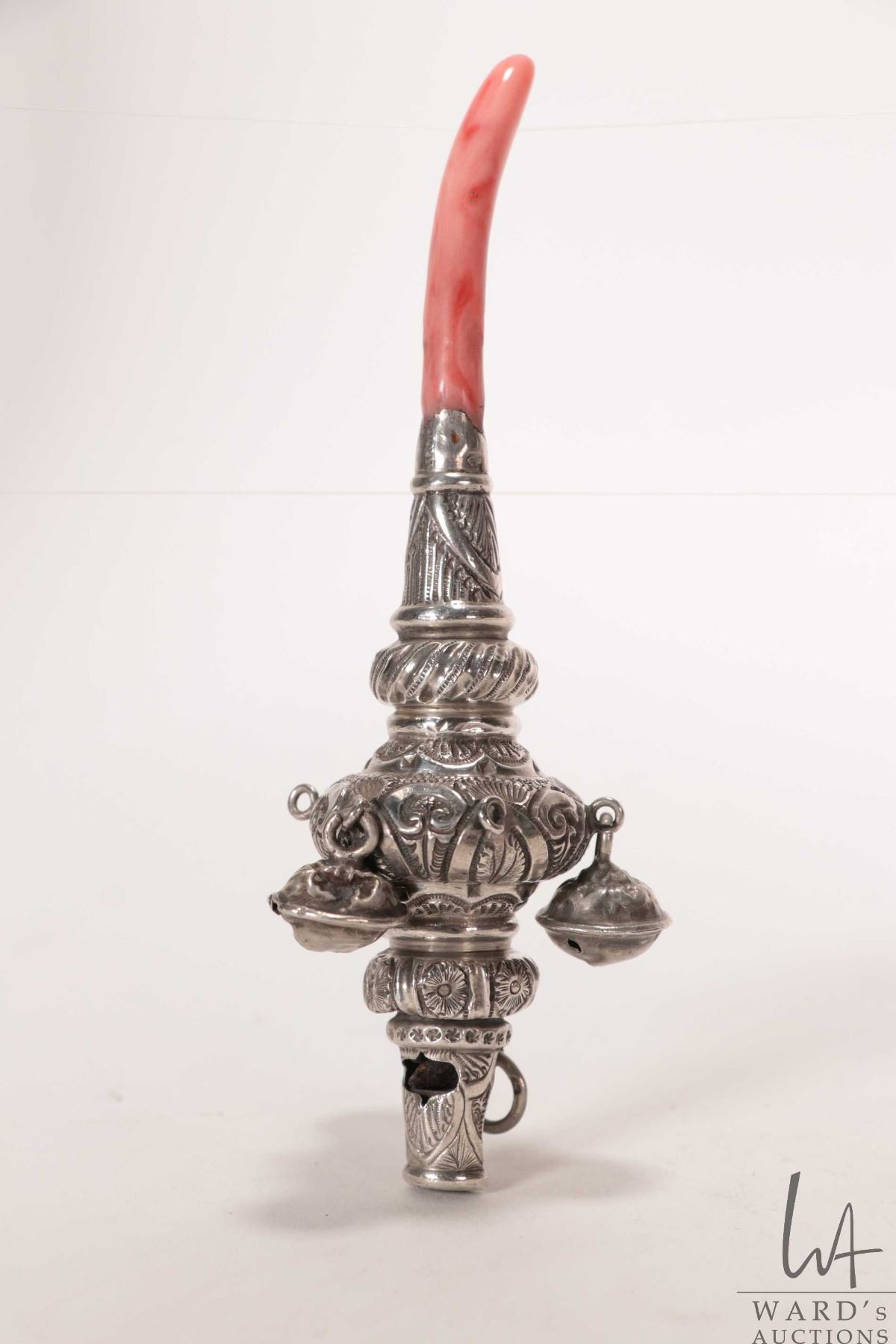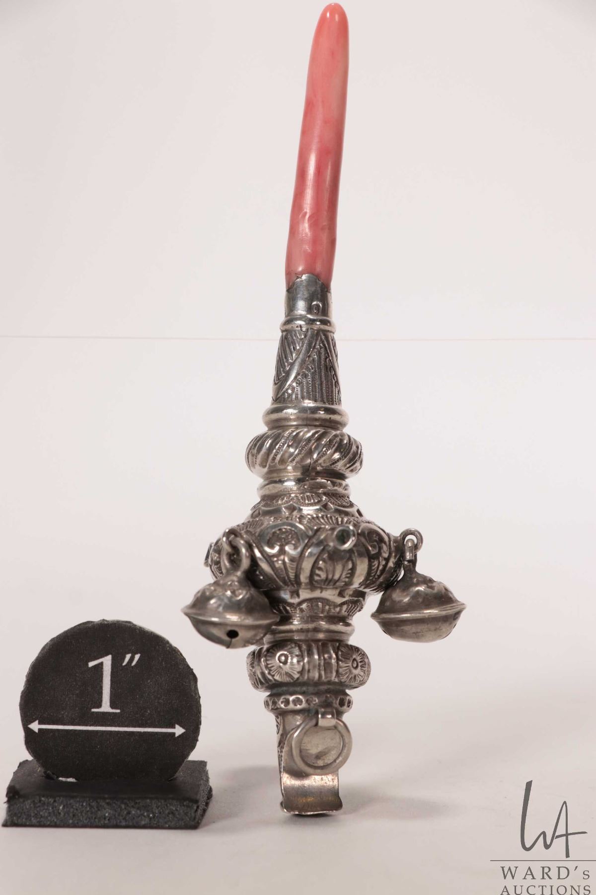 Antique sterling silver baby bells and whistle rattle with coral gum soother, marked with British st