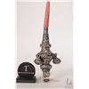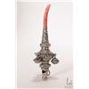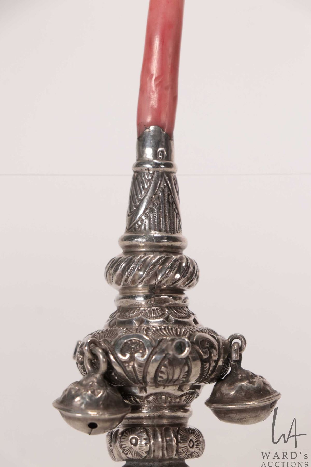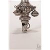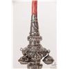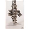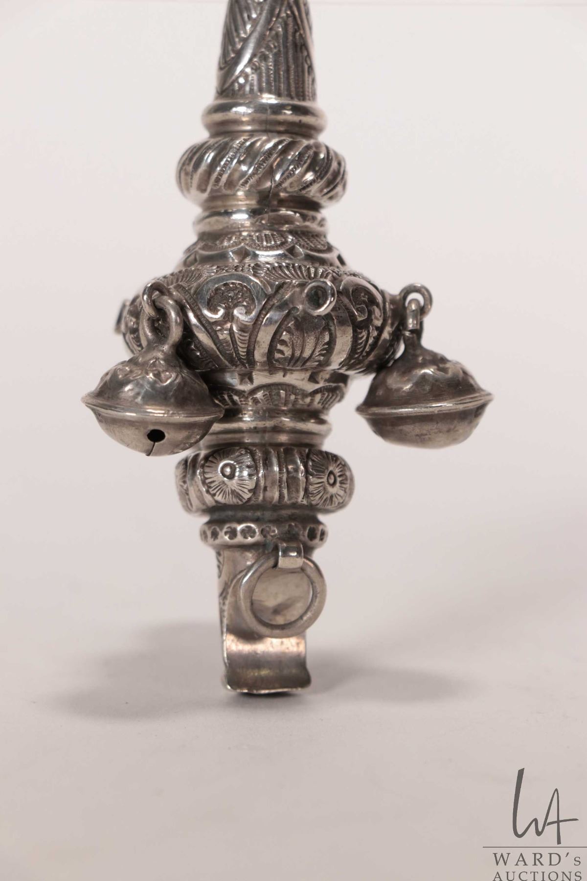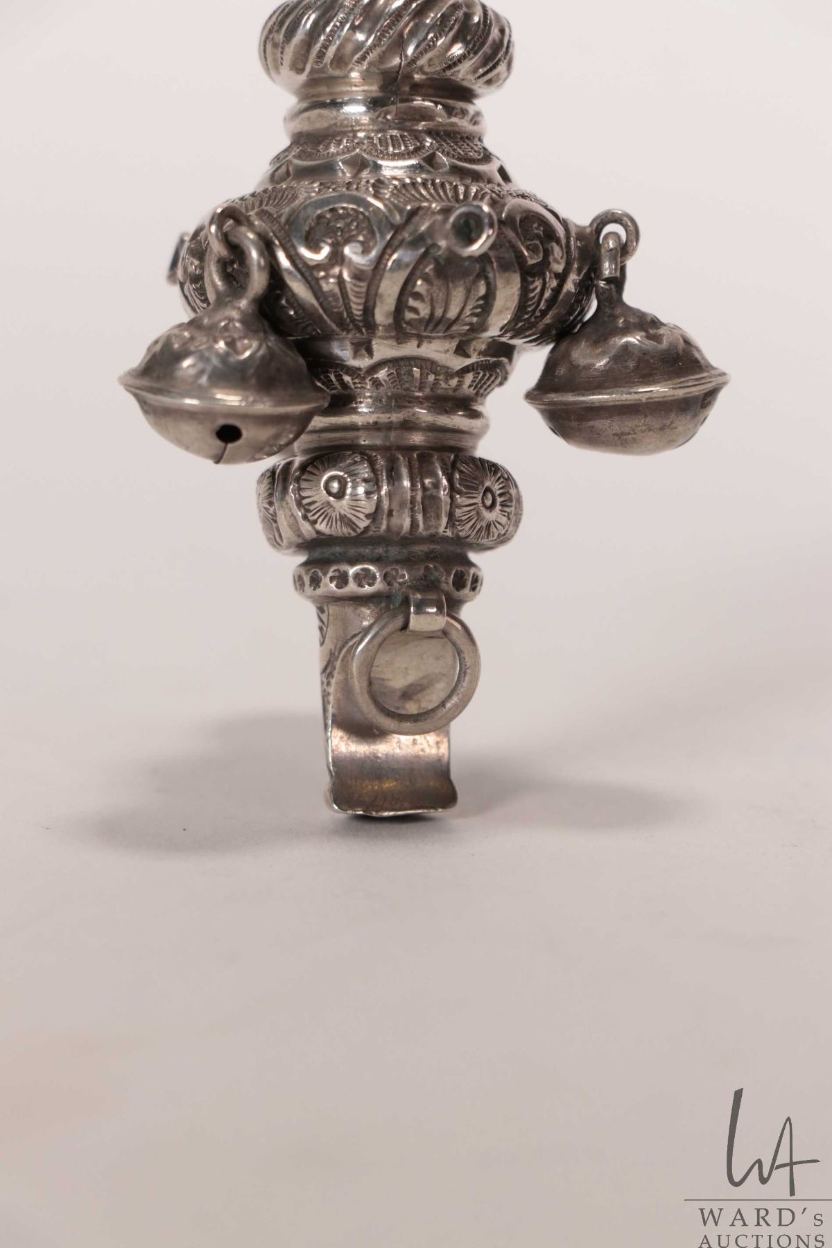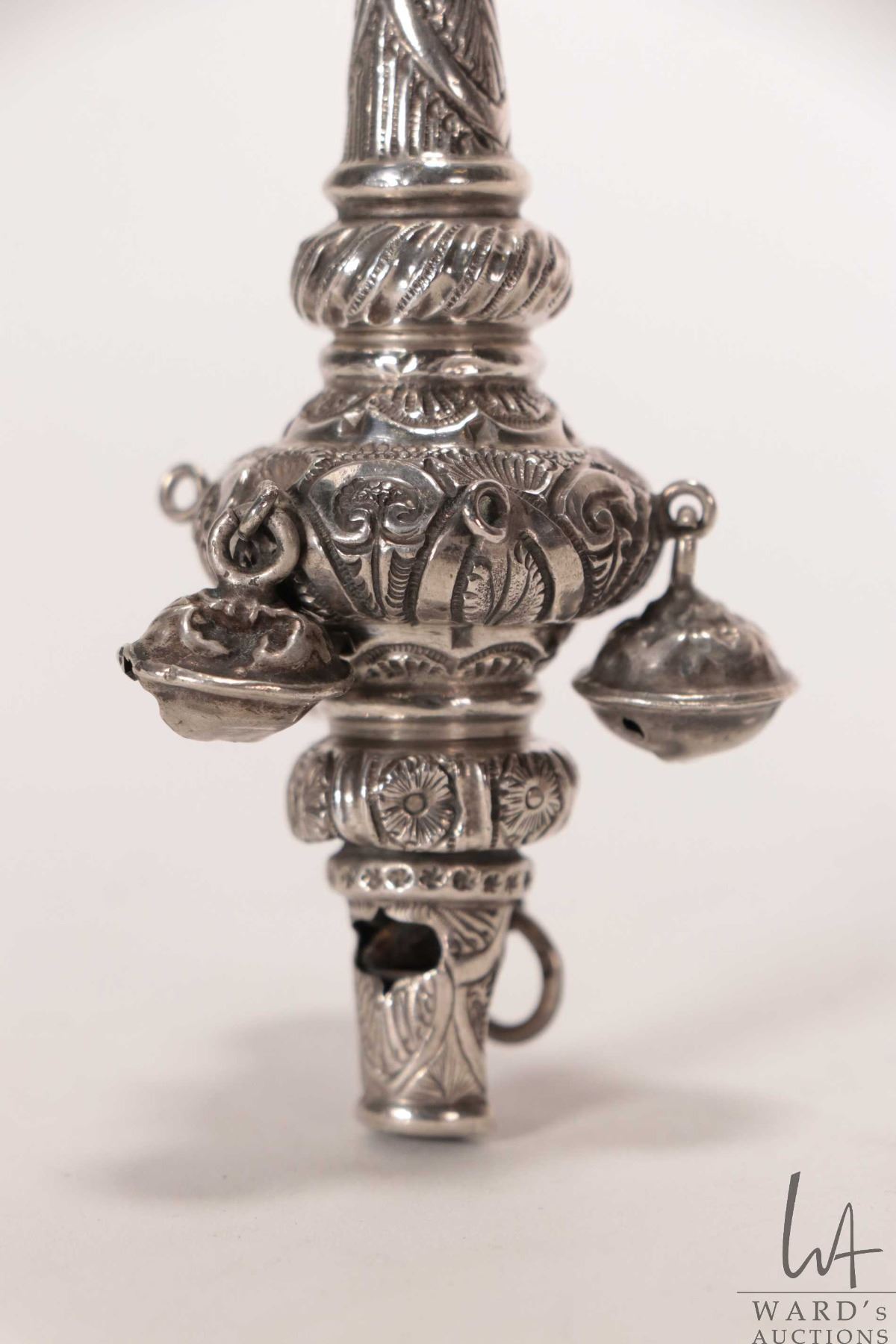 Antique sterling silver baby bells and whistle rattle with coral gum soother, marked with British st
