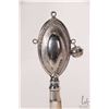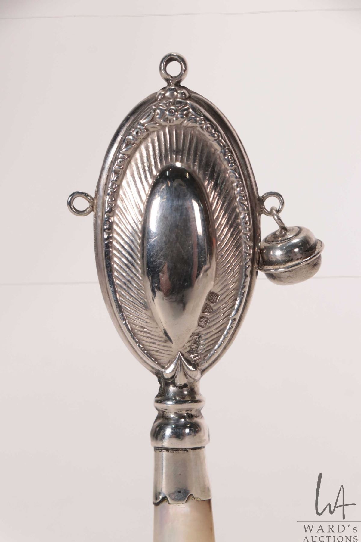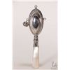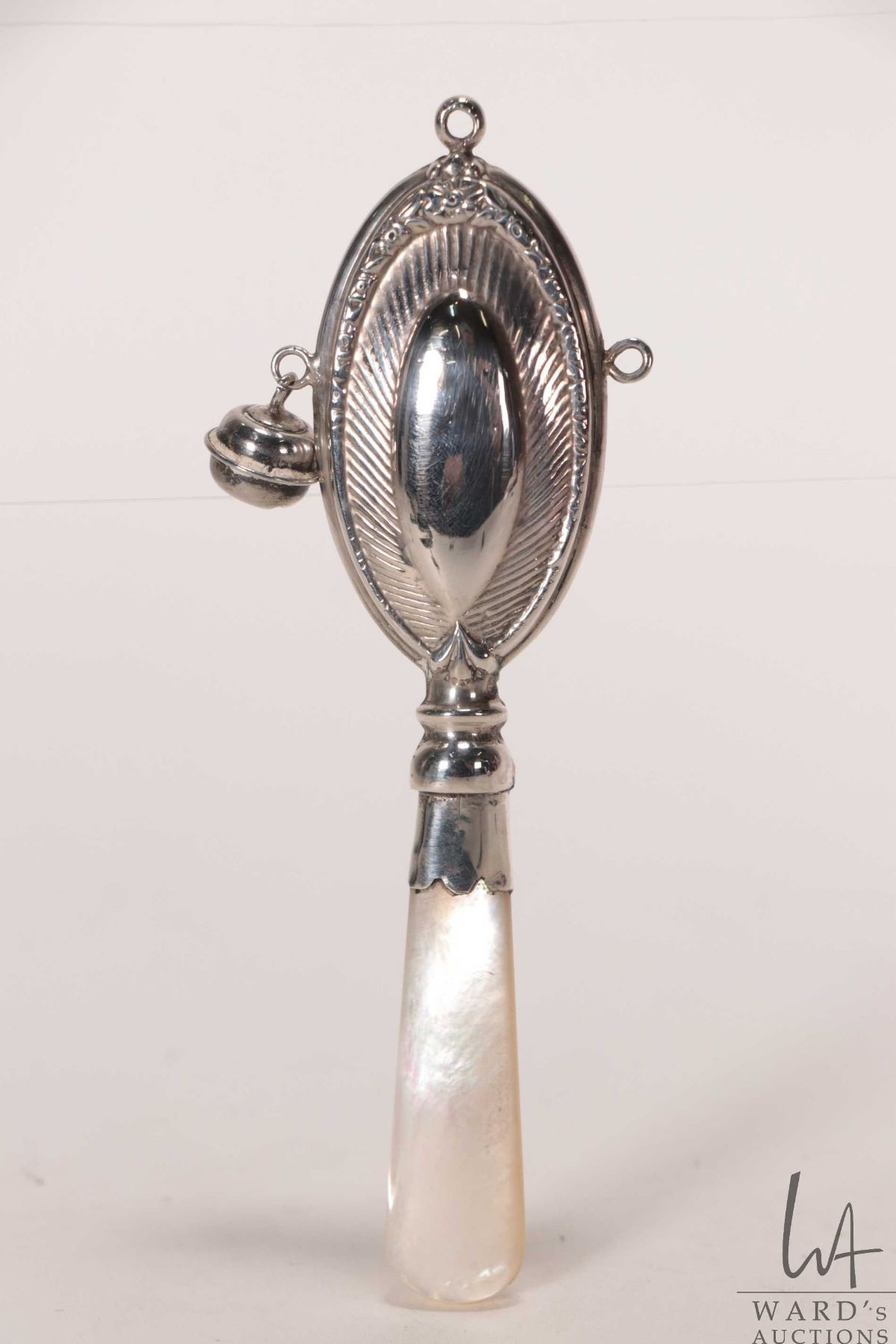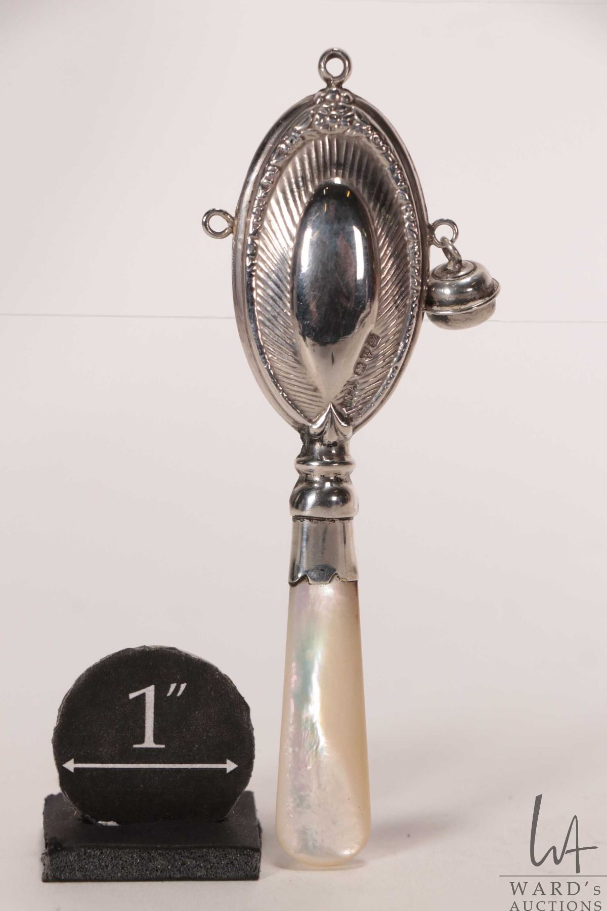 Antique sterling silver baby rattle with single bell and mother-of-pearl handle
