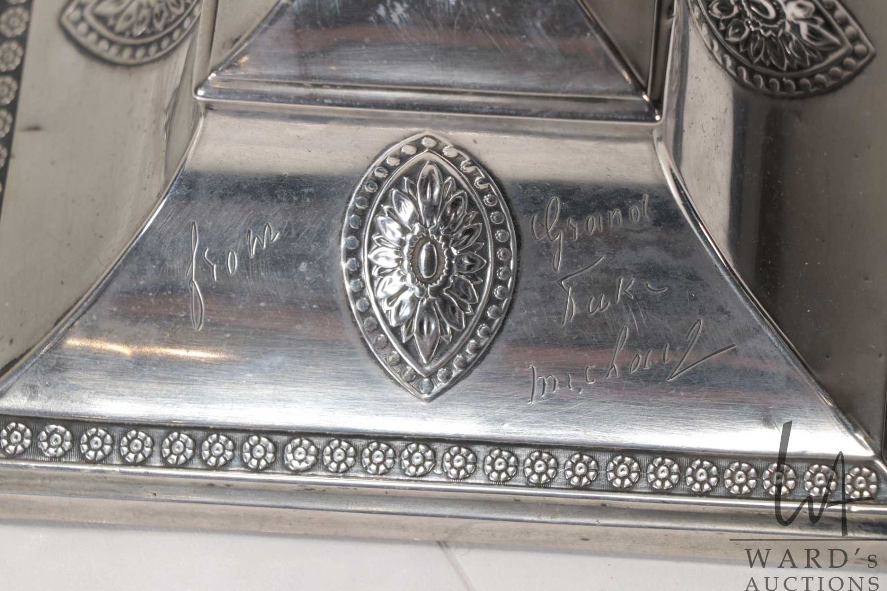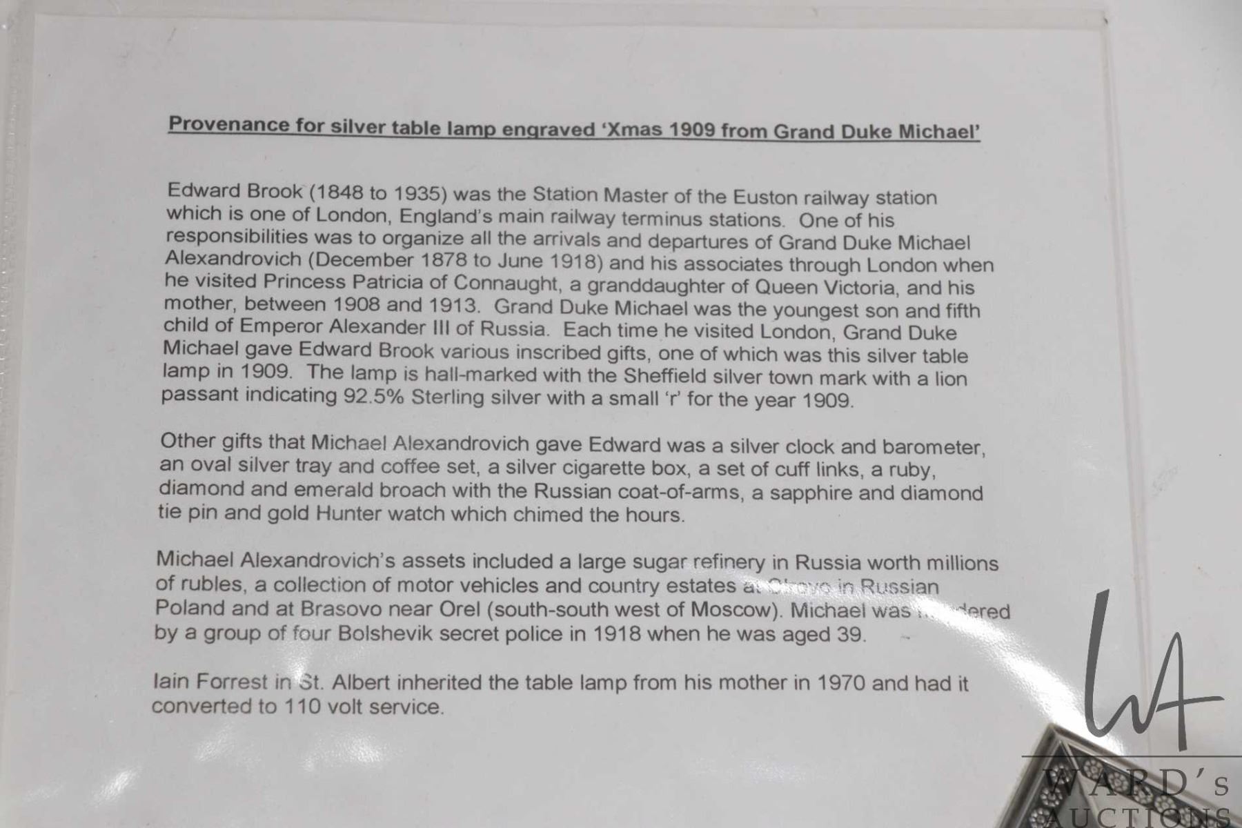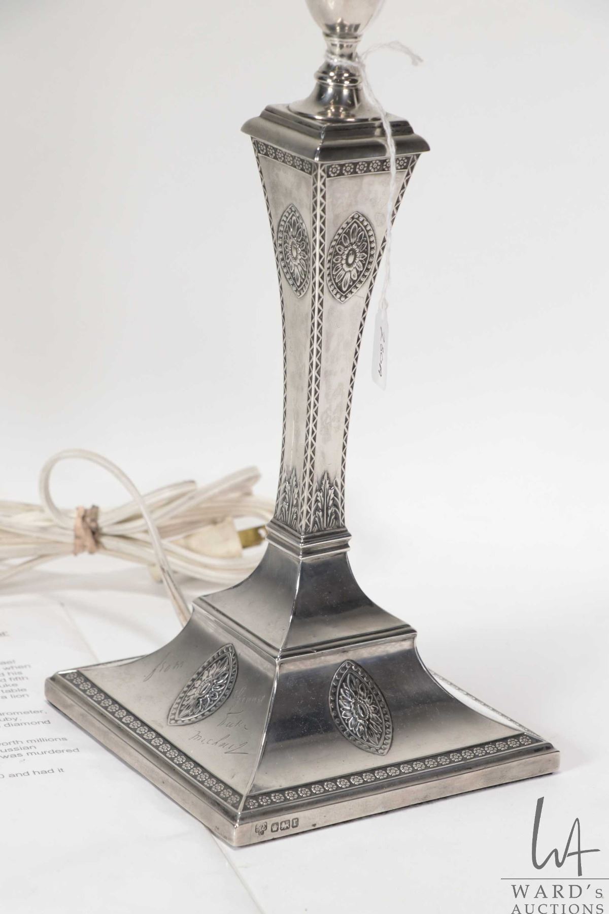 Antique sterling silver electric table lamp with a rich and royal provenance. Made by Hawksworth Eyre & Co, Sheffield in 1909. Purportedly presented and inscribed by the Grand Duke Michael Alexandrovich ( youngest son of Emperor Alexander III of Russia) at Christmas 1909 to Edward Brook (1848- 1935) who was station master at Euston Railway Station and the receipent of many gifts over many years from the Grand Duke. See photos of provenance