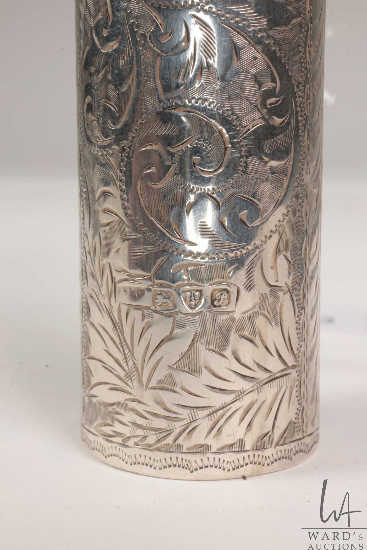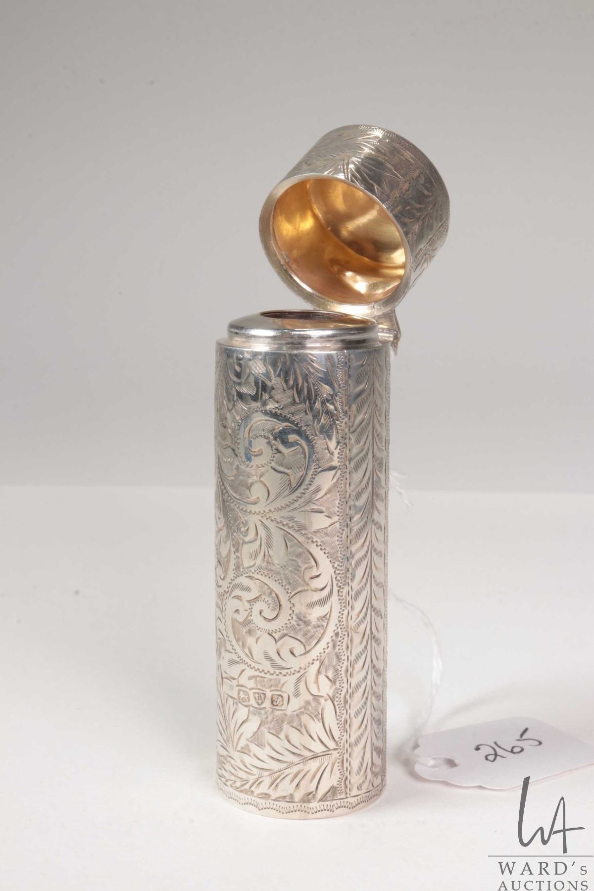 Antique sterling silver perfume, scroll work engraved with gold wash lid and British hallmarks, 3"