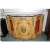 Antique style French design sideboard with two curved glass doors and center curved matched grain door, attached decorative ormolu and includes mismatched marble top, approximately 67" wide