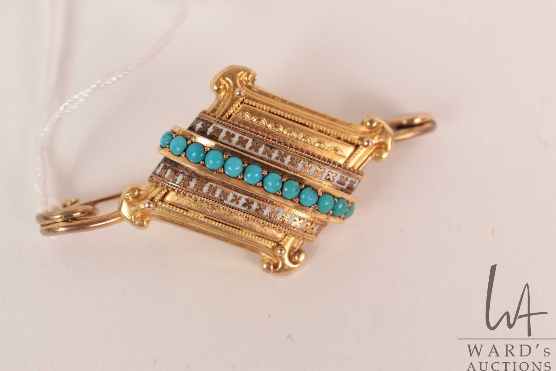 Antique tested 14kt yellow gold and turquoise gemstone brooch with white enameled decoration