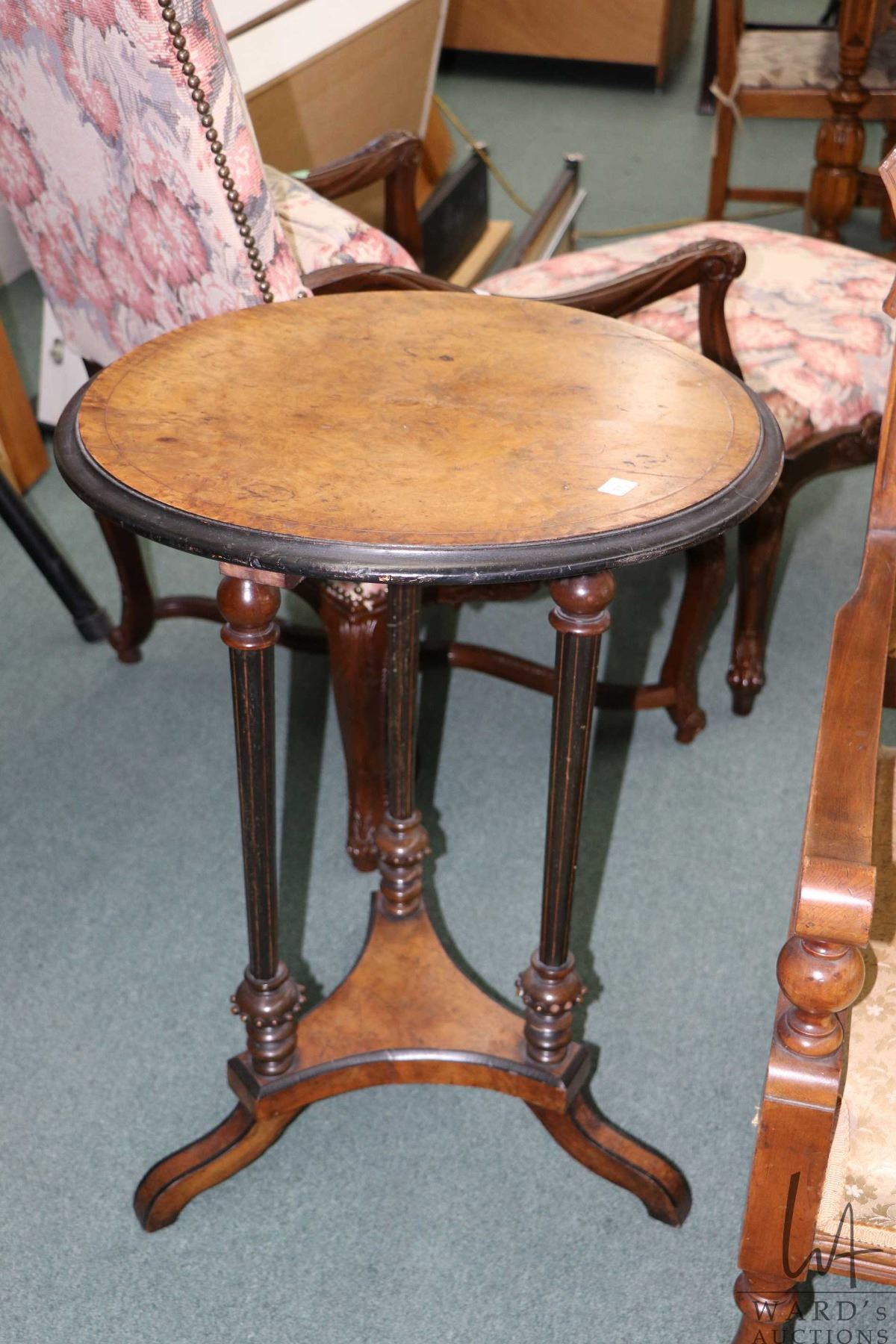 Antique three-tier snack butler with barley twist supports and an antique 21" diameter burl walnut occasional table with three decorative supports and splayed feet.