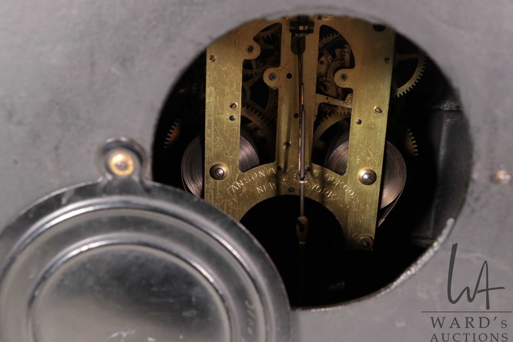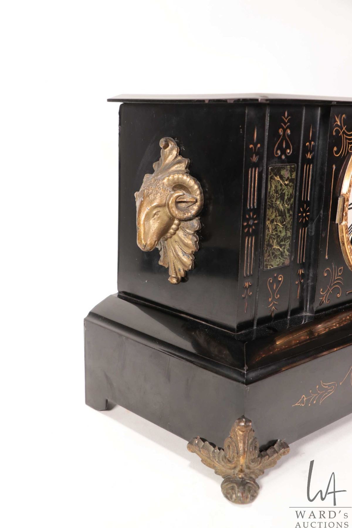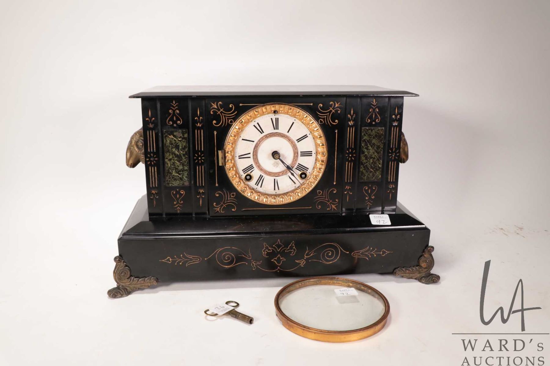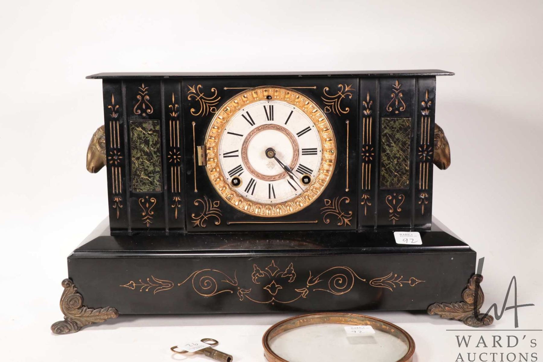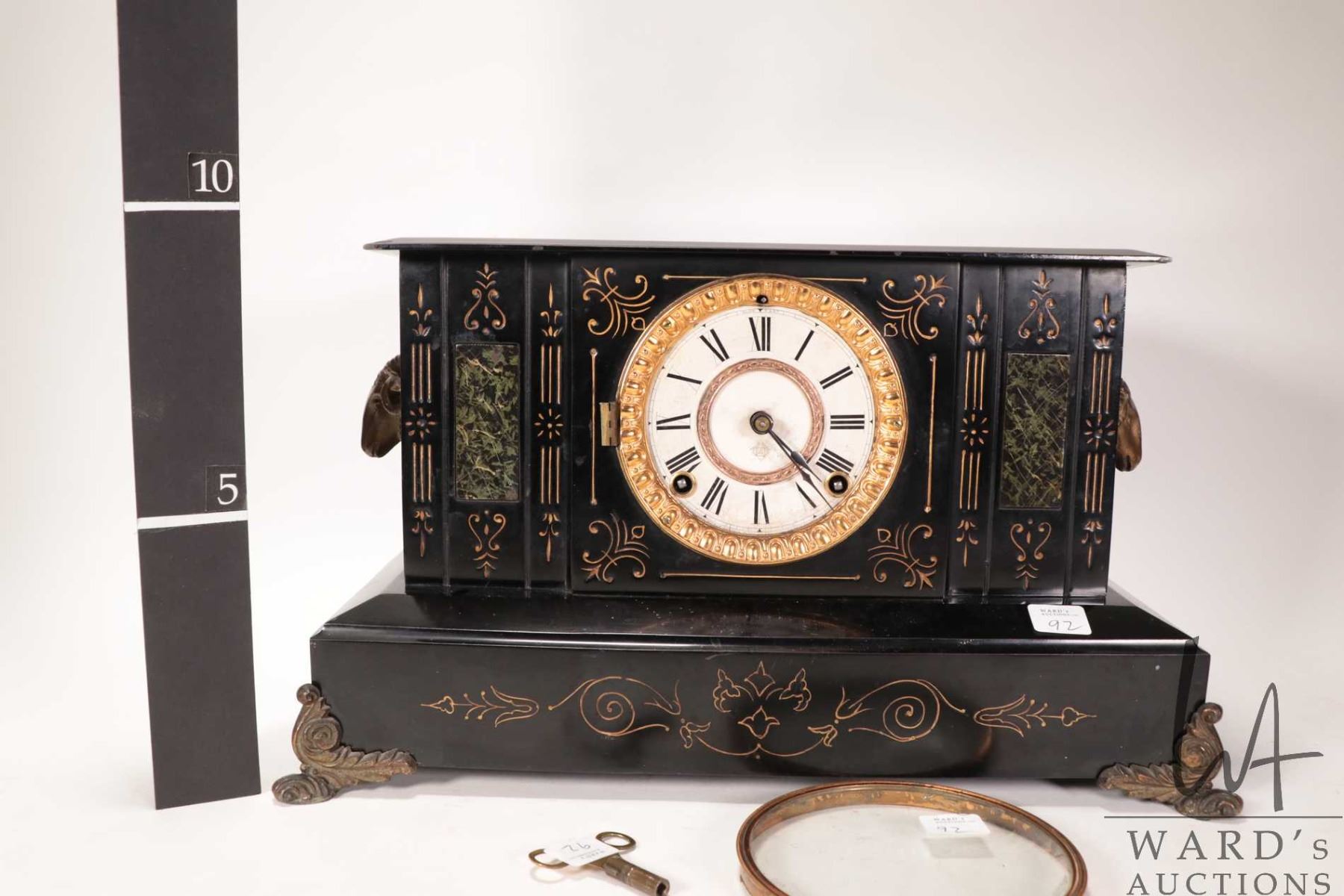 Antique tin, slate style chiming mantle clock with attached ram head garnitures, white sunk enamel dial and Roman numerals, made by The Astonia Clock Company, New York, note: not working at time of cataloguing, appear complete, 9 1/2" H X 16" W