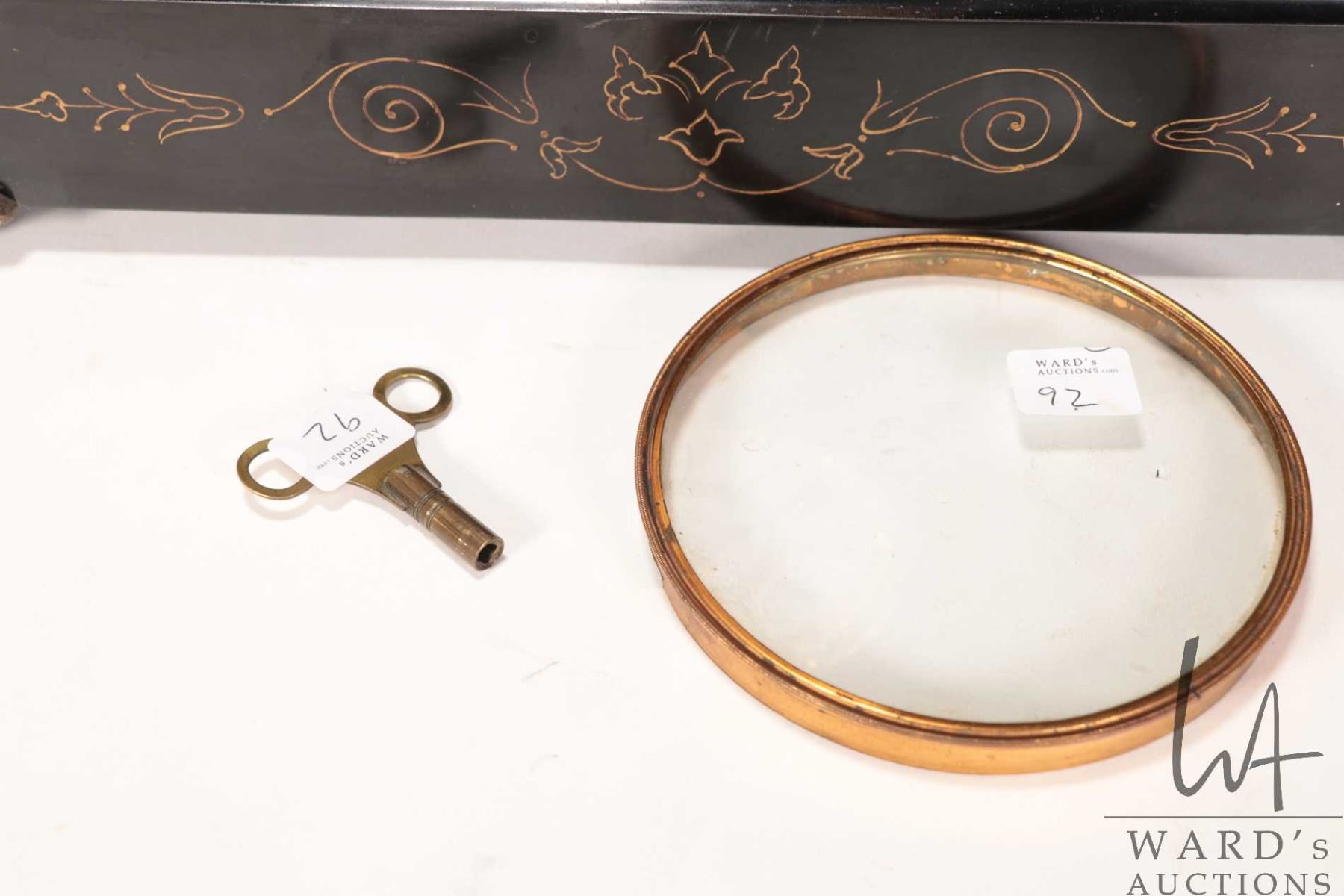 Antique tin, slate style chiming mantle clock with attached ram head garnitures, white sunk enamel d
