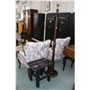 Antique turned wooden lamp pole with no fixture and a black painted primitive bench