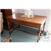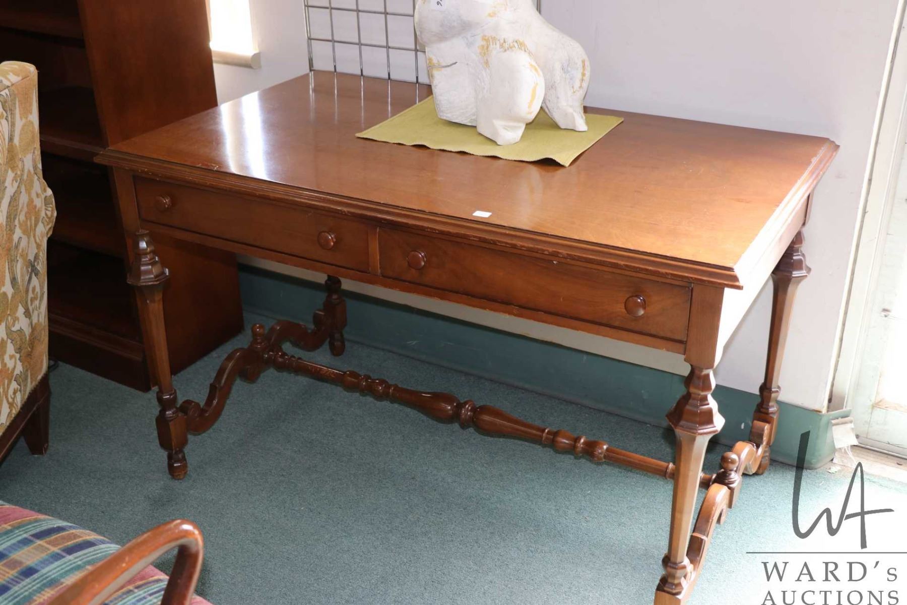 Antique two drawer library table with decorative supports and stretcher, 30" H X 48" W X 28" D