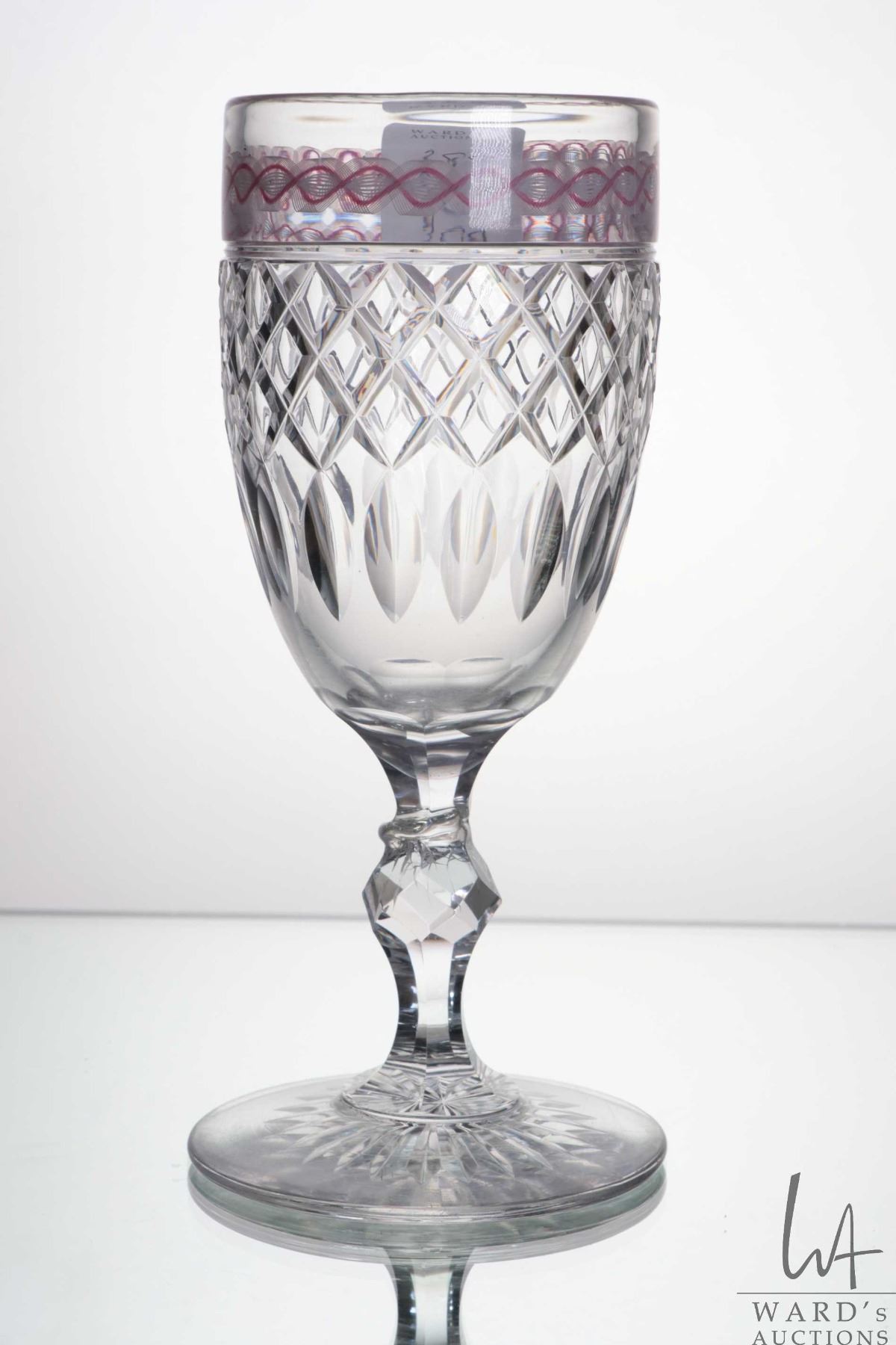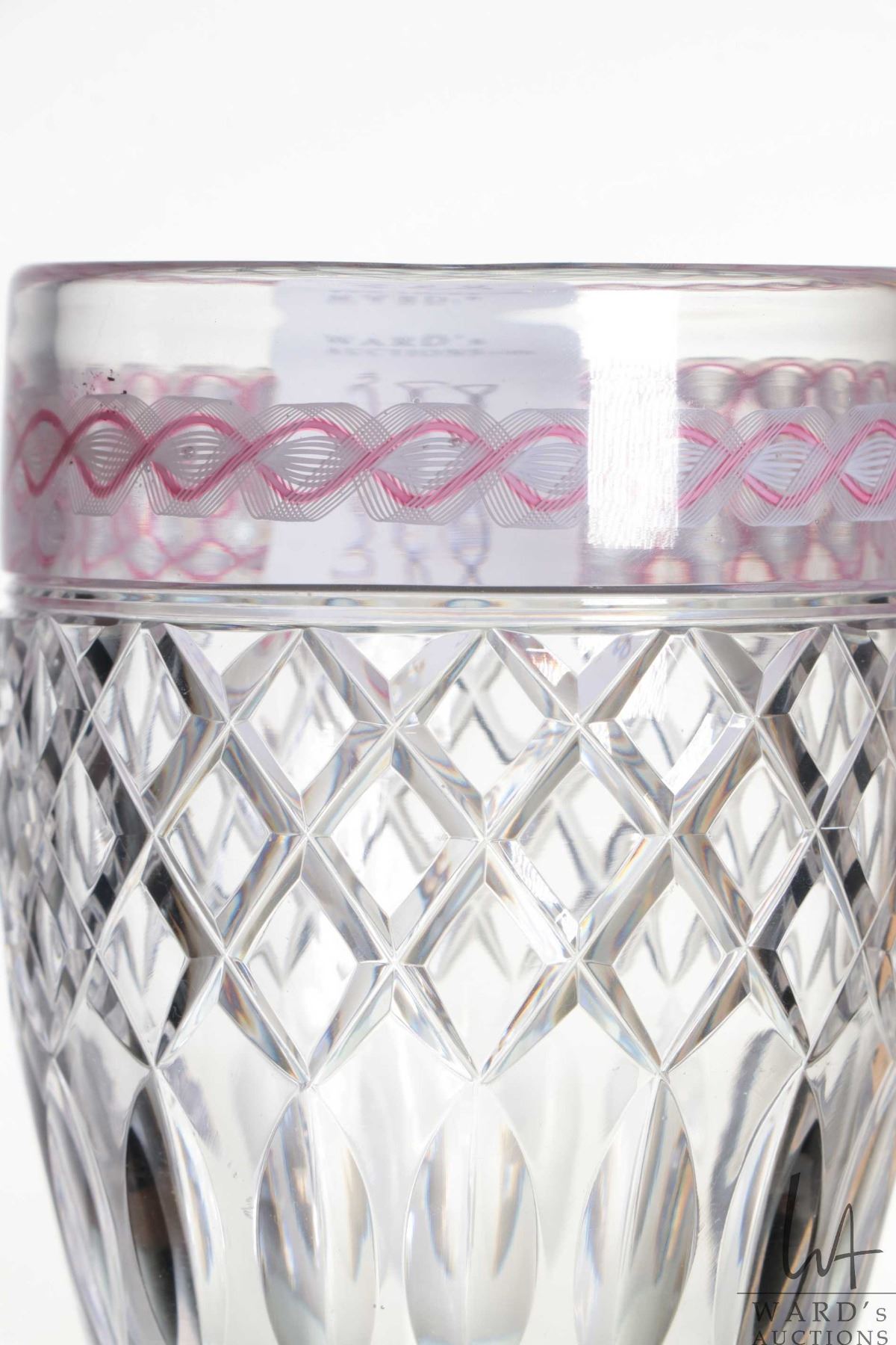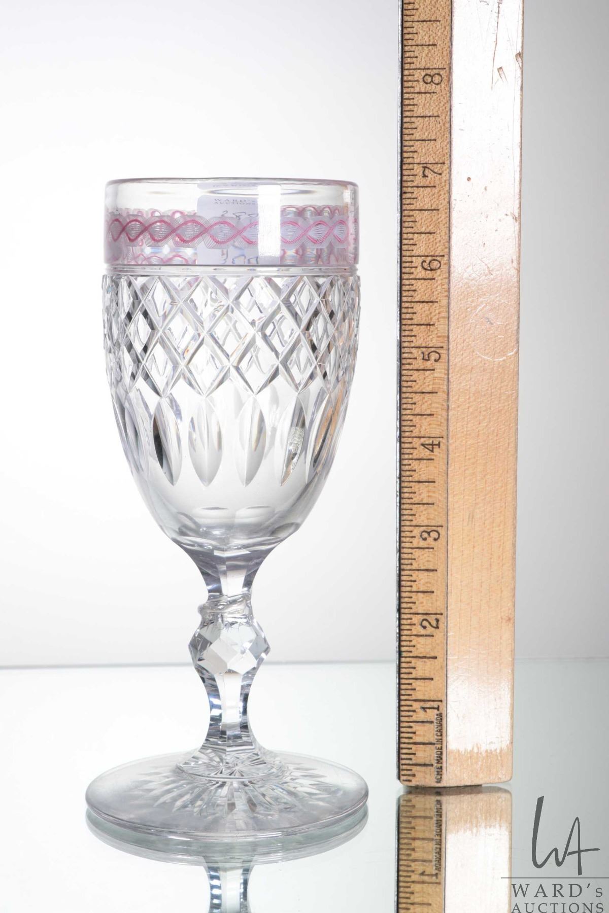 Antique/ vintage quality crystal goblet with air twist white and pink ribboning around rim and faceted crystal stem, note spidering where bowl meets stem, possibly old repair?, 17cm in height