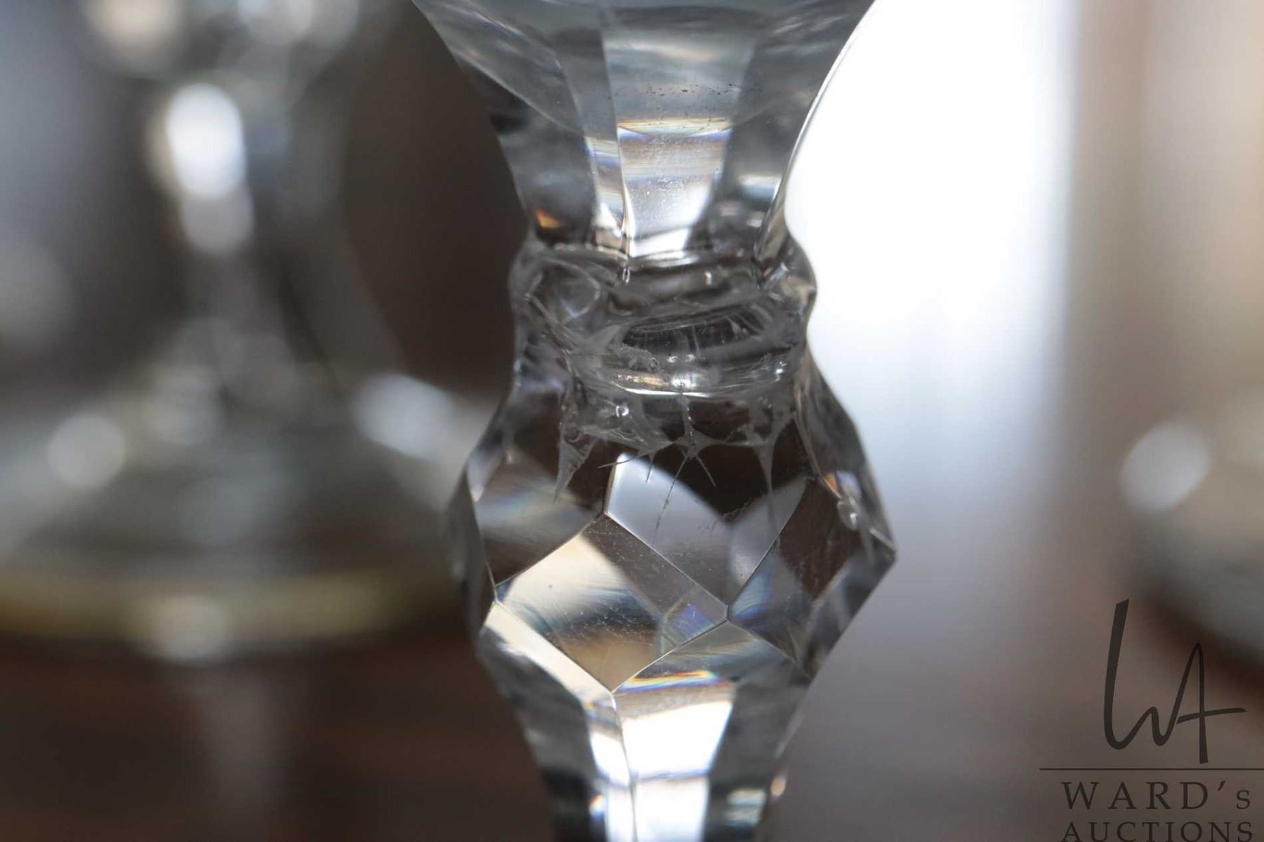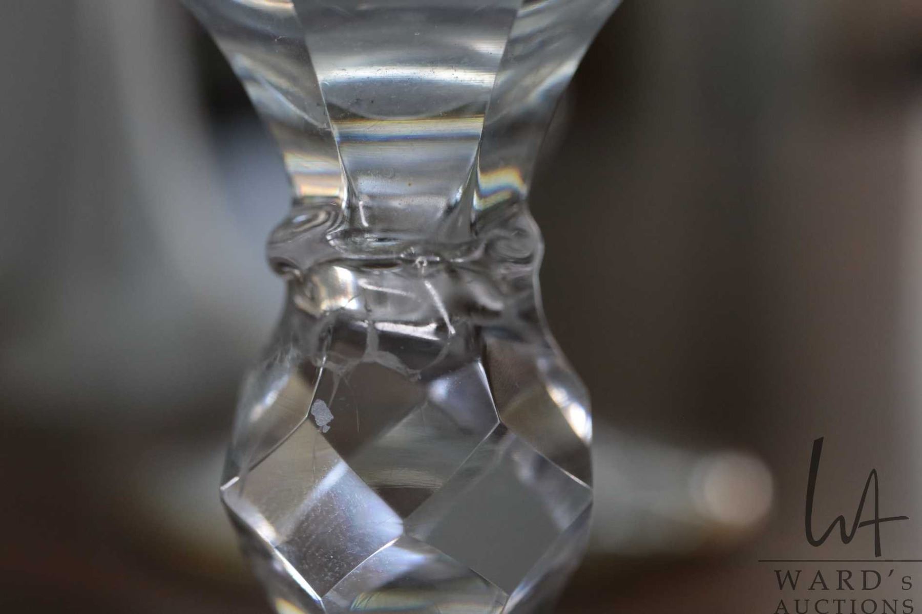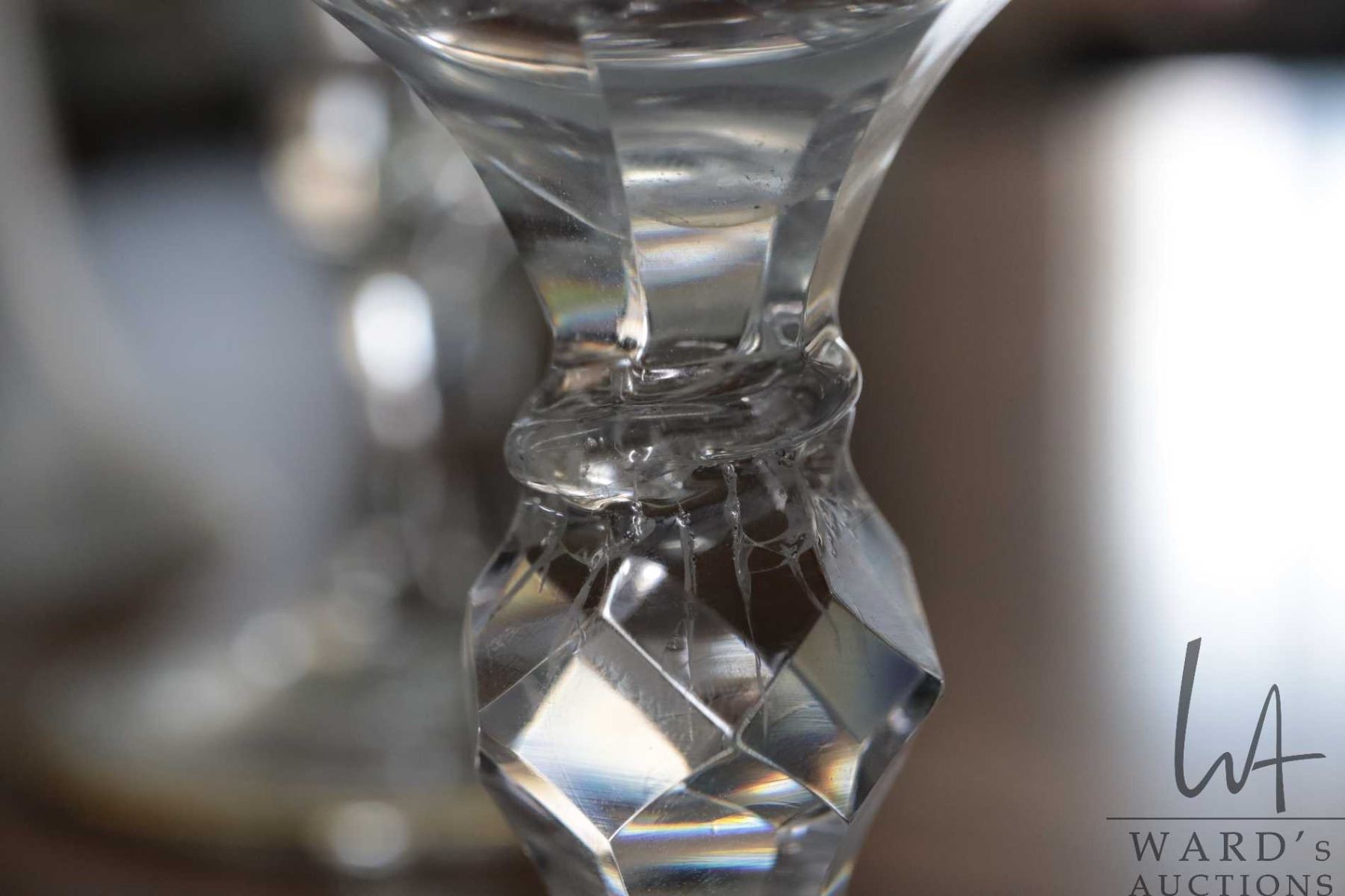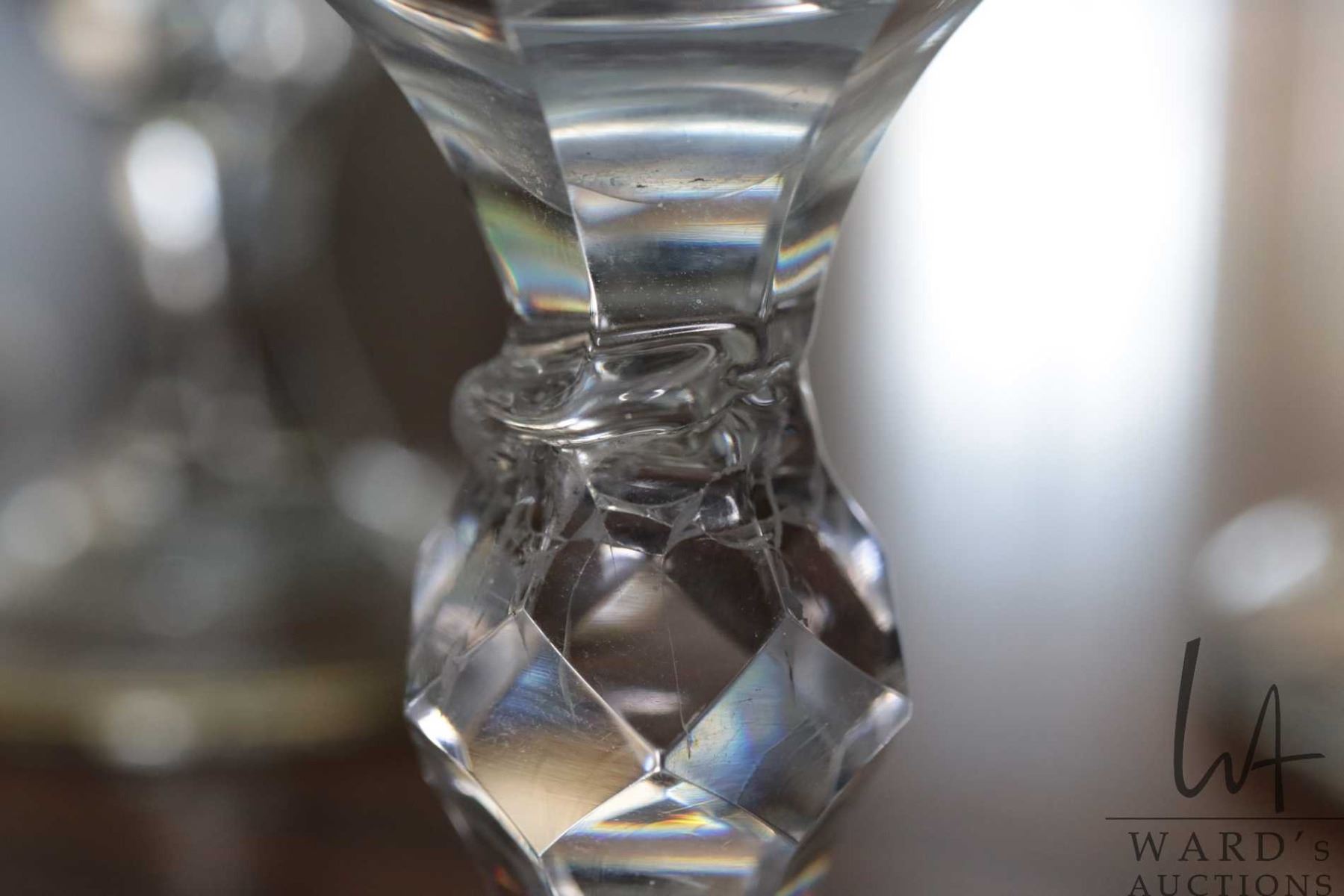 Antique/ vintage quality crystal goblet with air twist white and pink ribboning around rim and faceted crystal stem, note spidering where bowl meets stem, possibly old repair?, 17cm in height