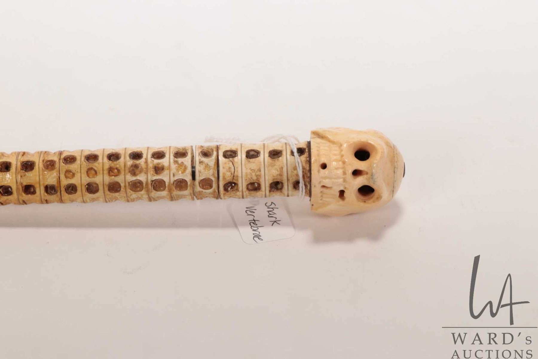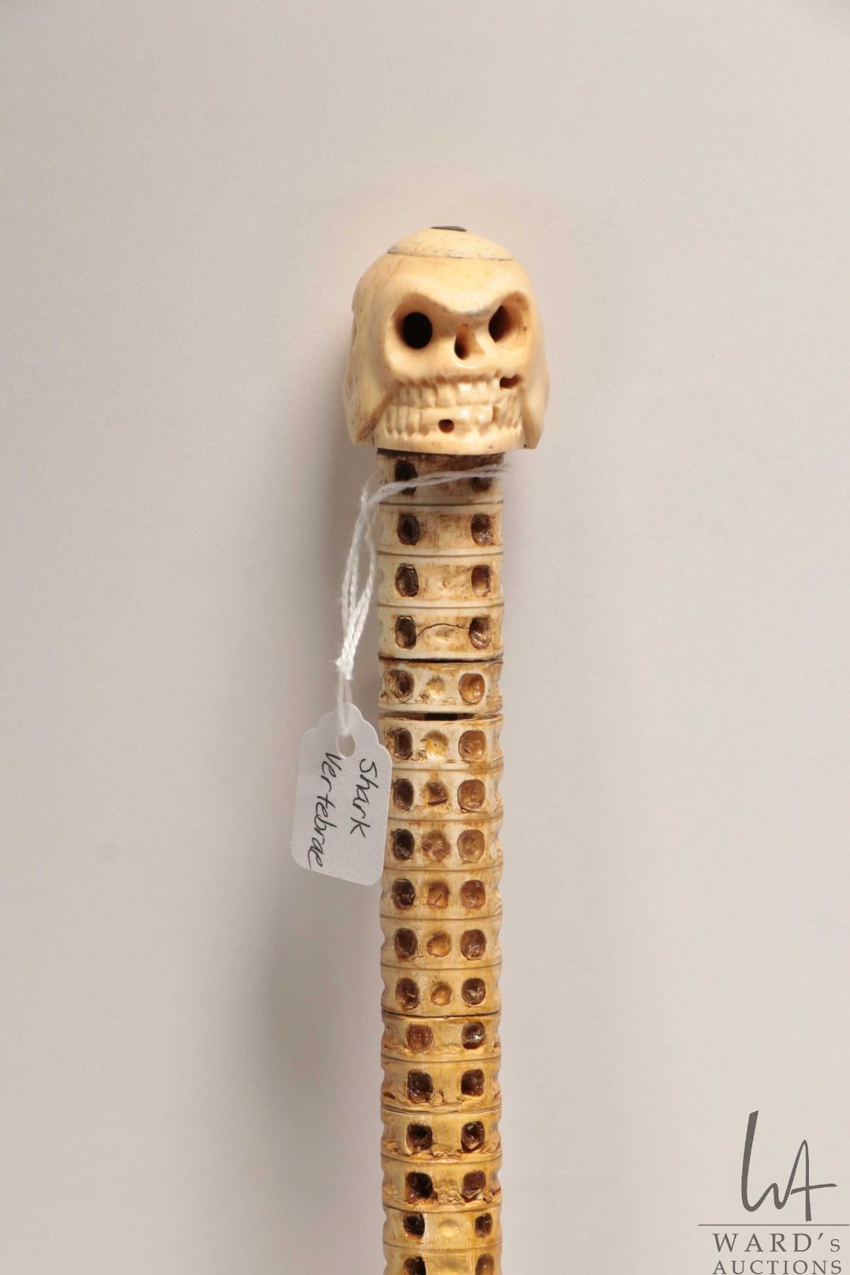 Antique walking stick made from the vertebra of a shark with a human skull top made from whale bone, 33" in height