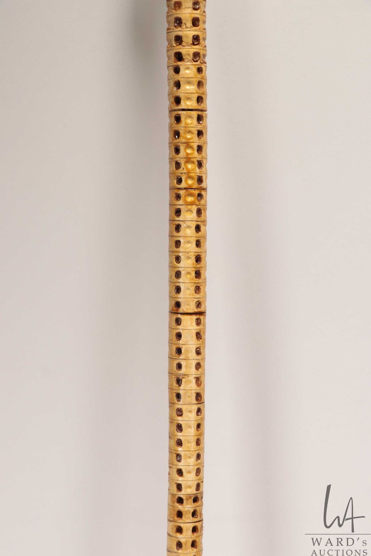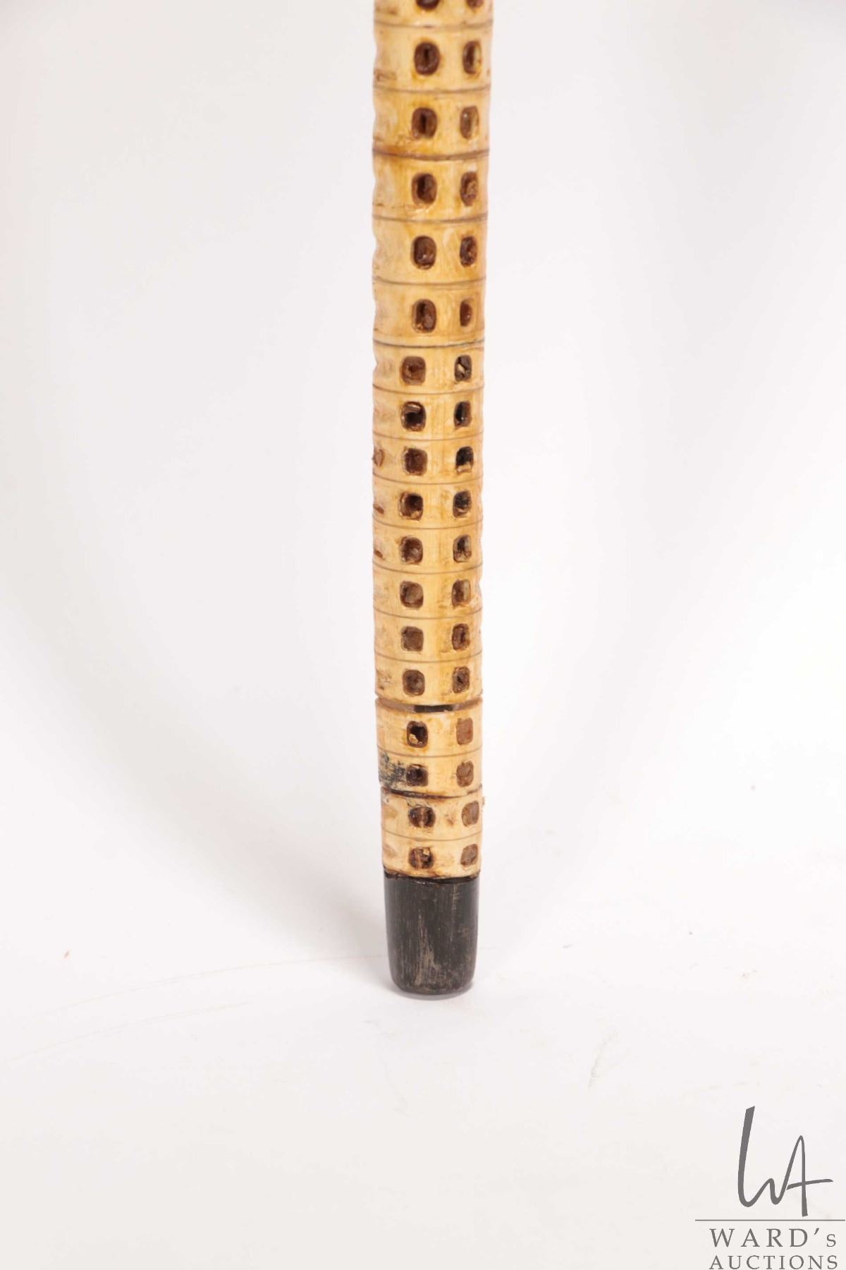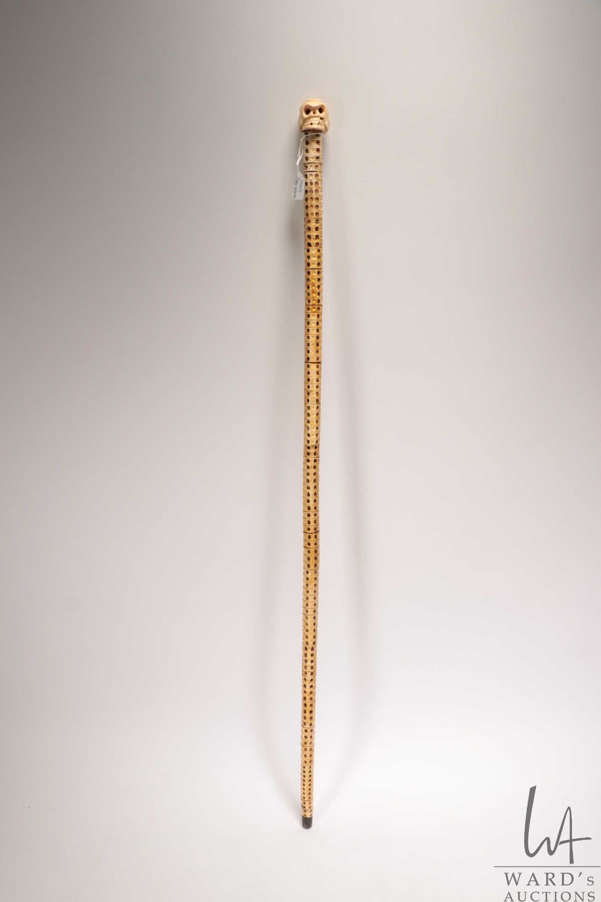 Antique walking stick made from the vertebra of a shark with a human skull top made from whale bone,