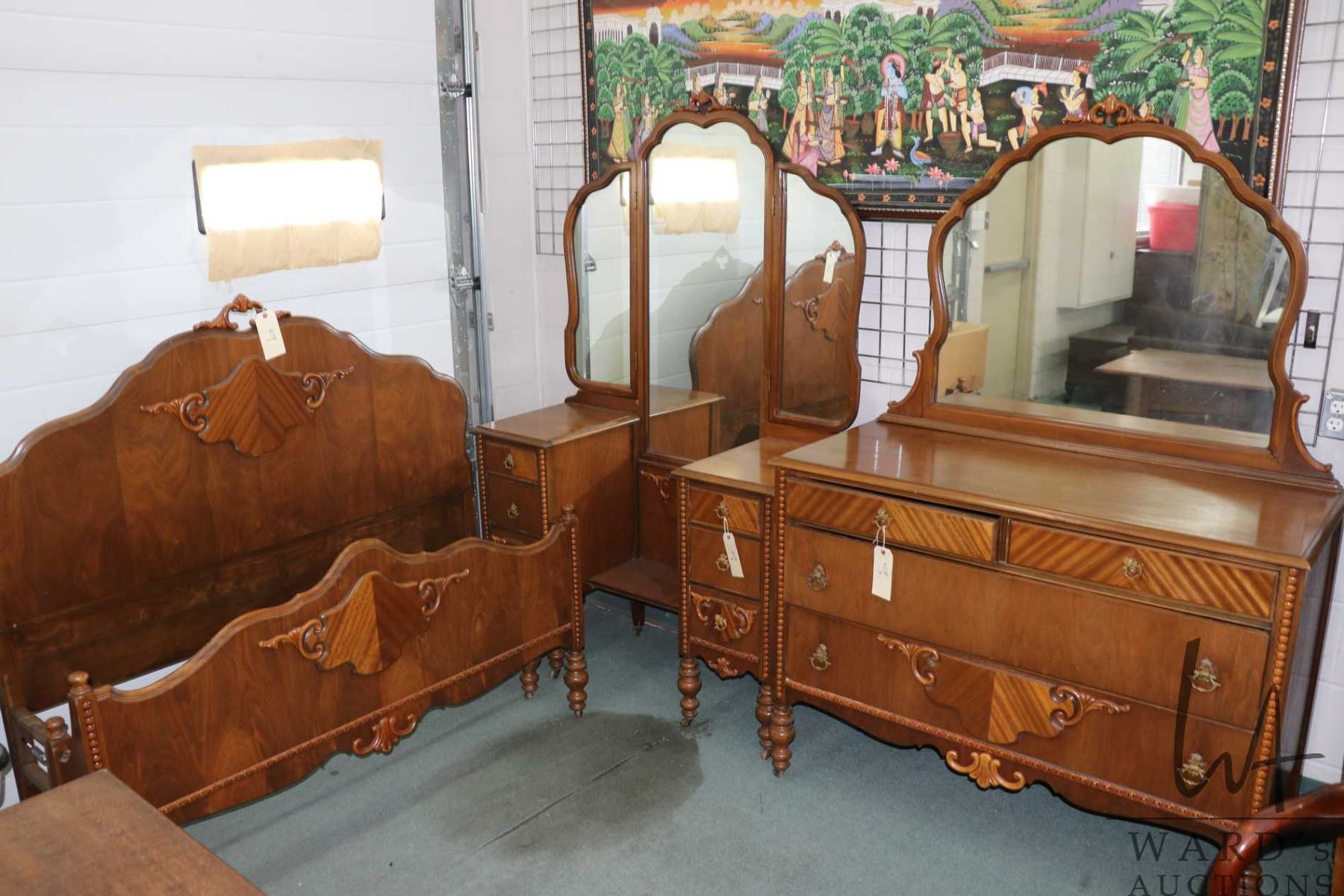 Antique walnut bedroom suite including double sized headboard, footboard and rails, dropped vanity with swing mirror and four drawer mirrored dresser.