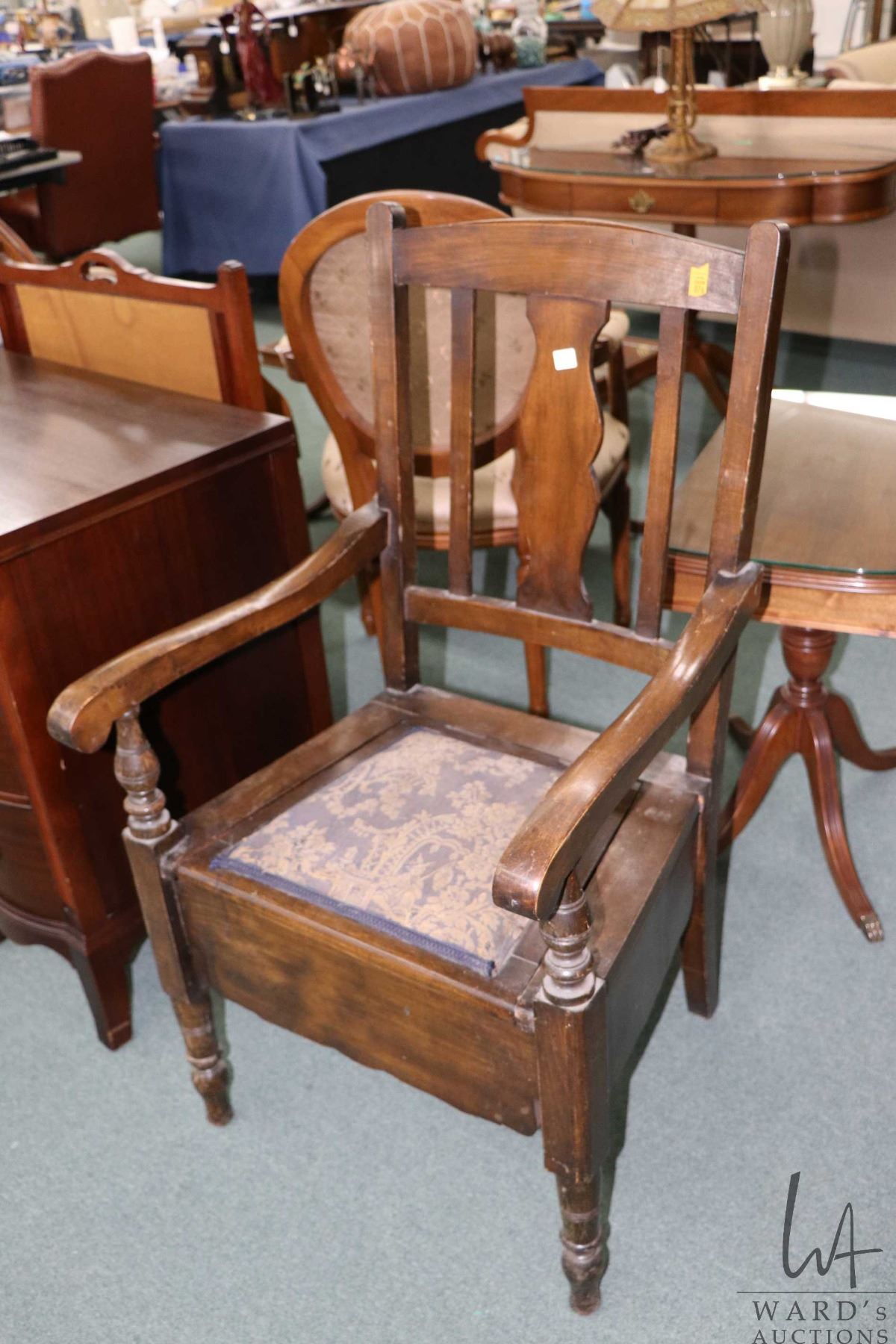 Antique walnut comode chair with flip up seat and glazed ironstone lidded commode