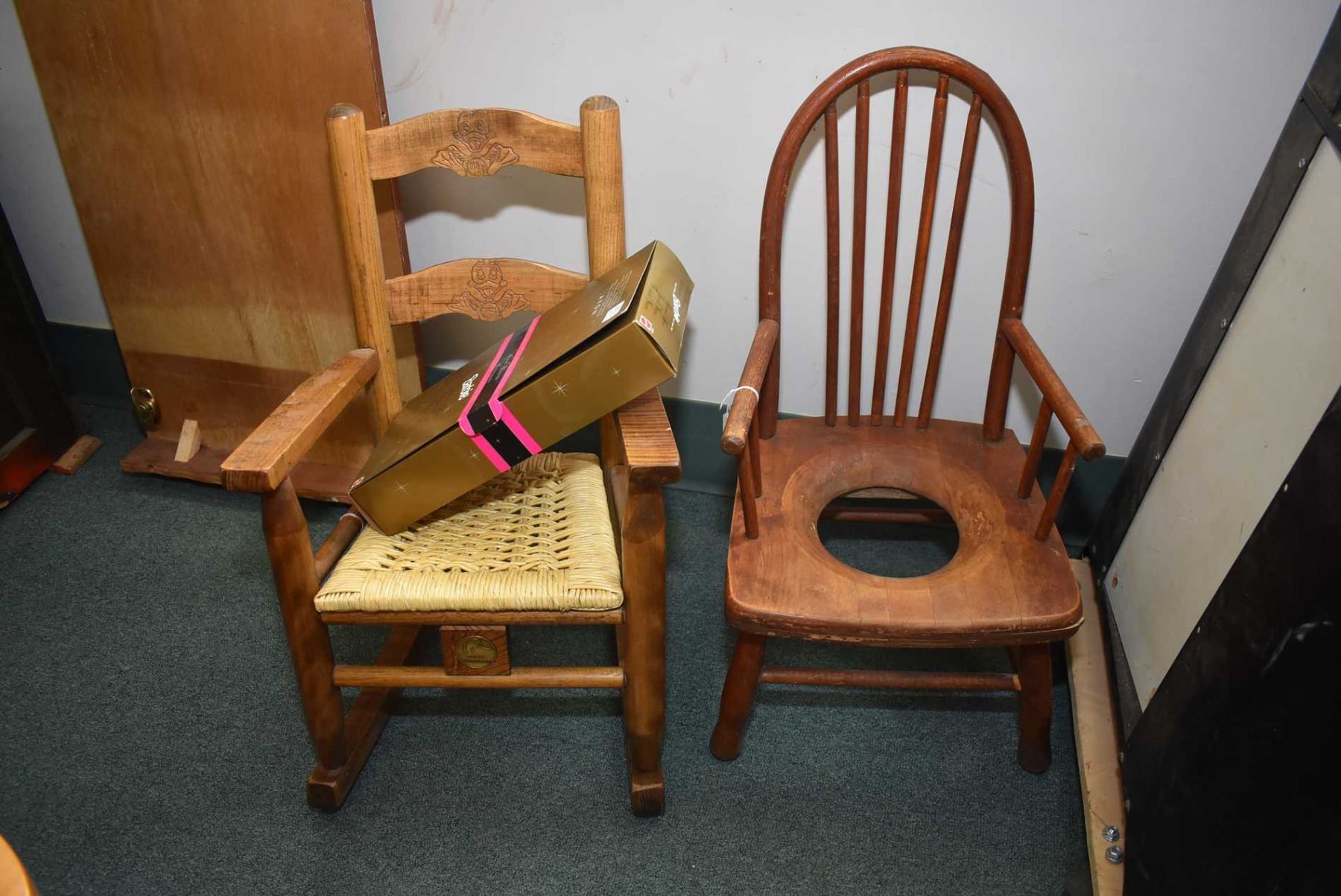 Antique wooden potty chair and a Ducks Unlimited open arm rattan seat rocking chair made by "The VMH Quality Woods Collection" with Daisy and Donald duck carved stretcher and Ducks Unlimited medallion plus a boxed Barbie Doll