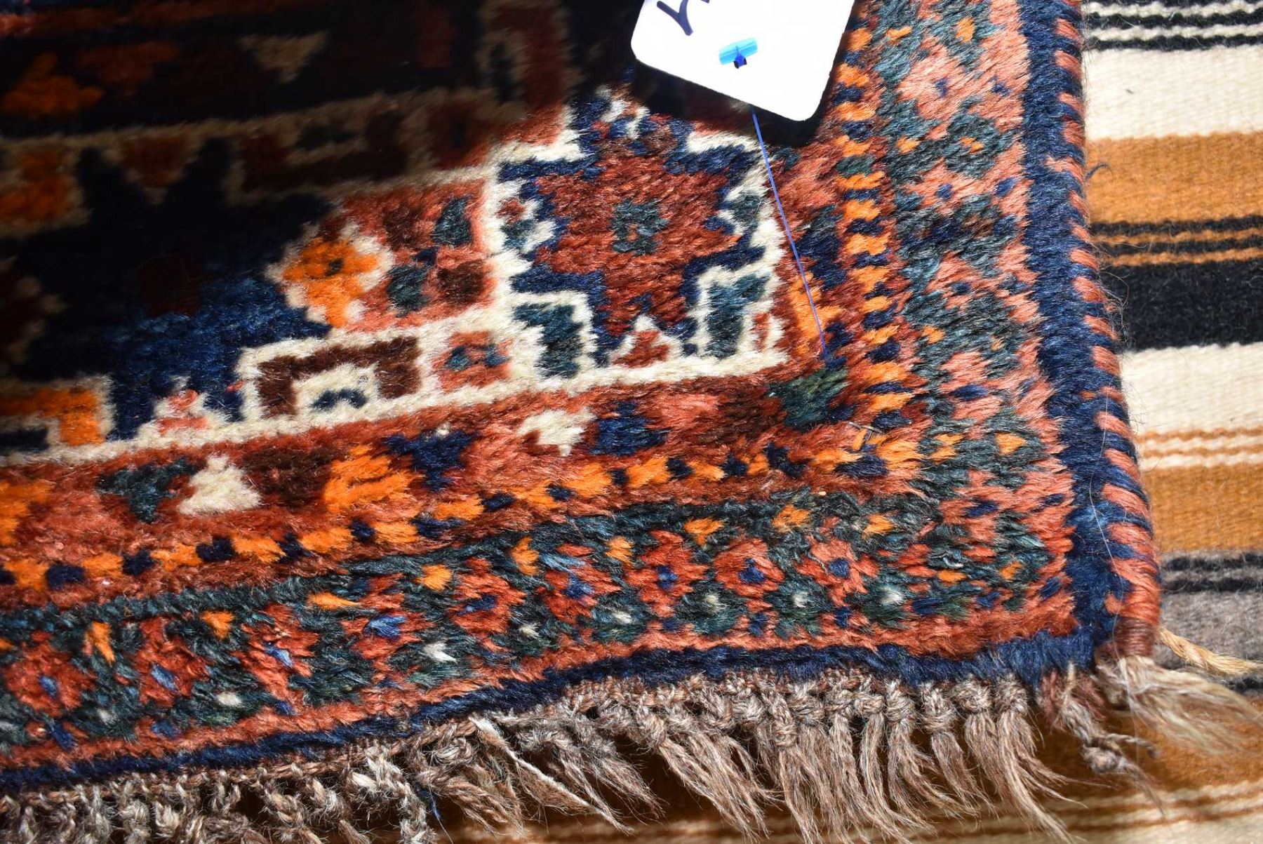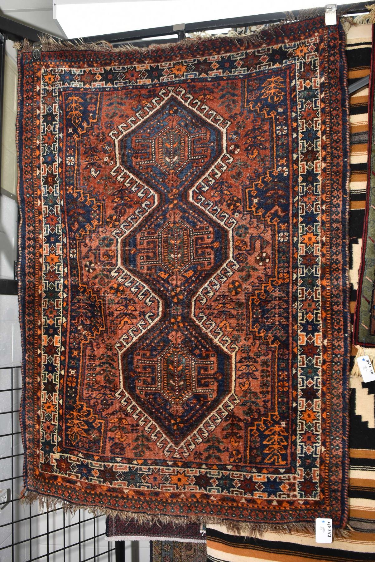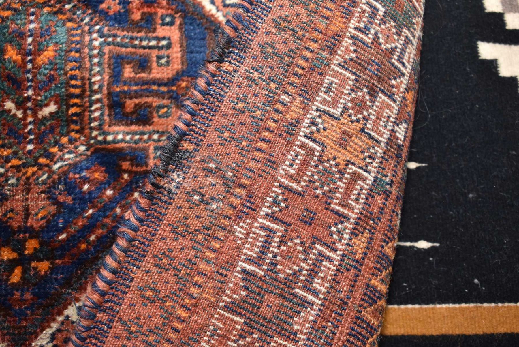 Antique wool throw carpet with center medallion in shades of reds, orange, blues etc. 43" X 58"