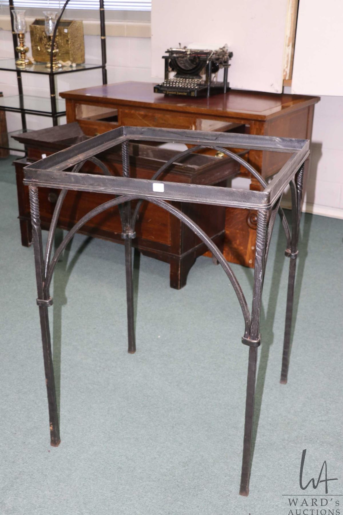 Antique wrought iron table base with twisted support uppers, 34" H X 25" square, ready for the addition of granite, glass or hardwood top