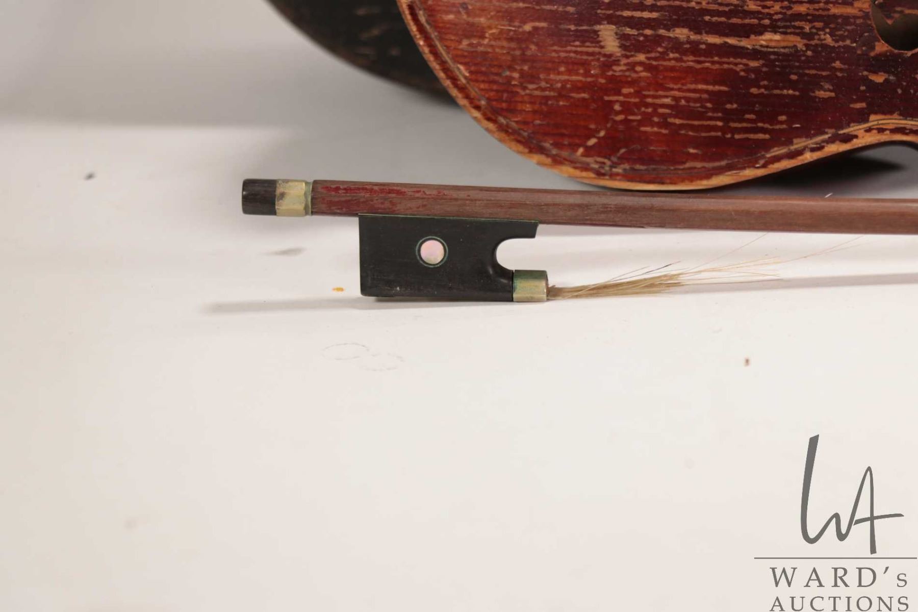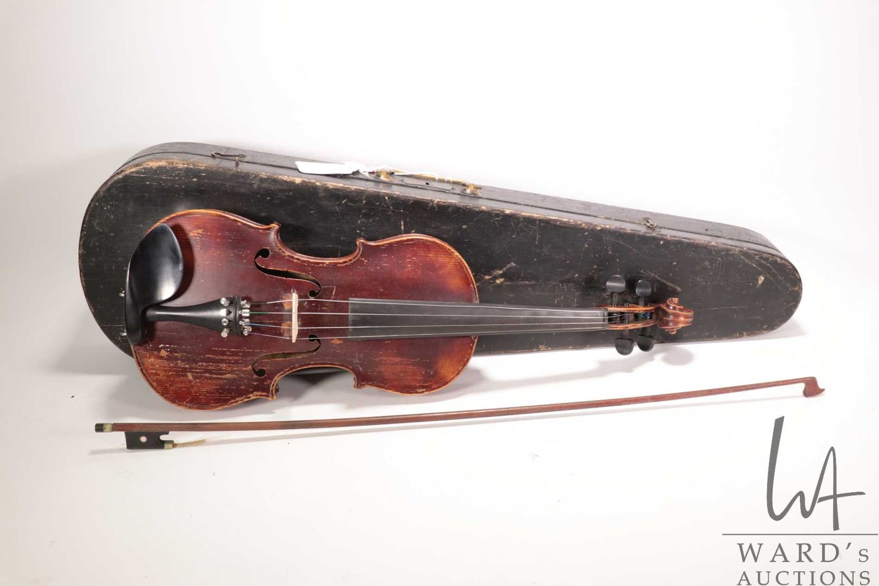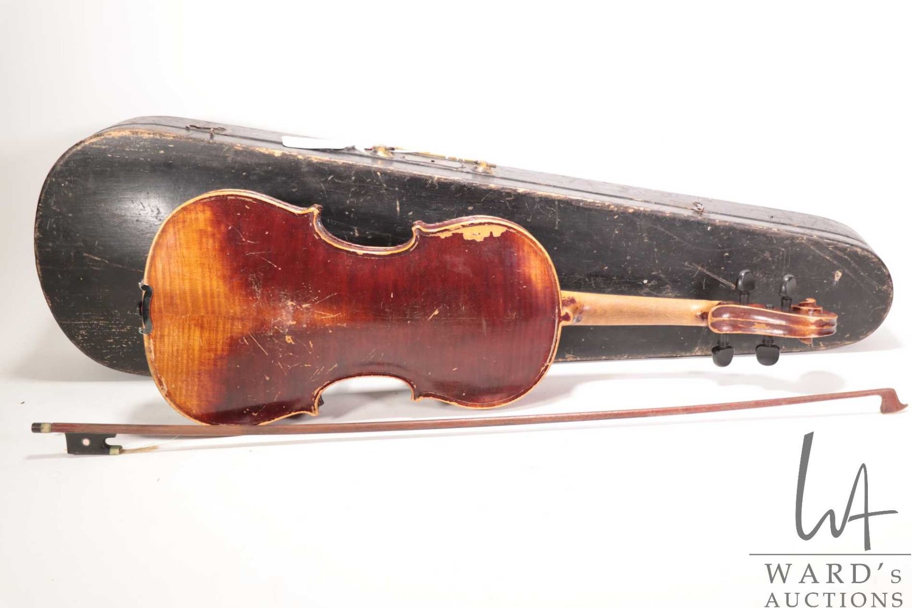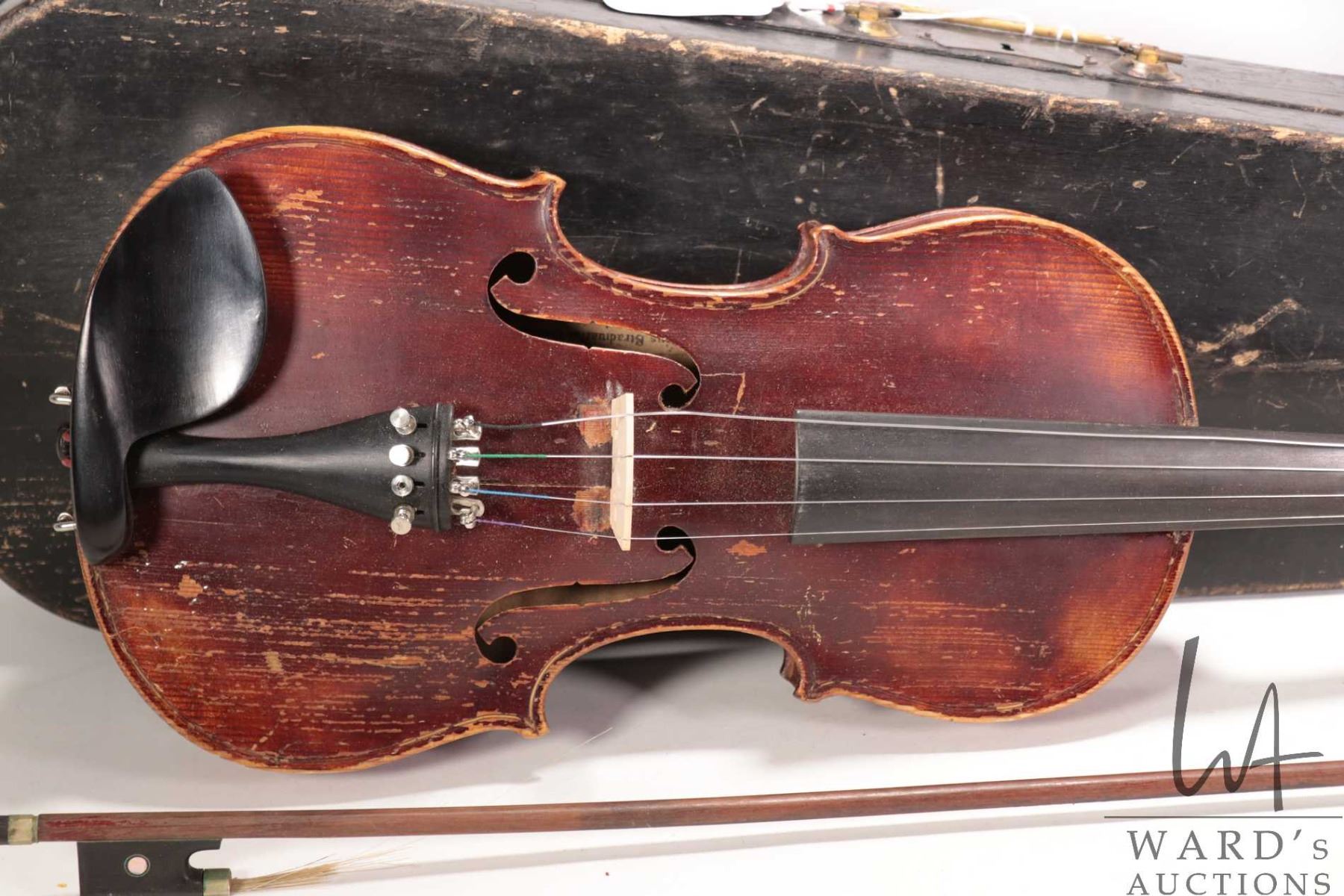 Antonius Stradivarius Cremonenfis 4/4 violin, labeled "Faciebat Anno1723". Includes worn wooden case, broken bow. Finish on violin is distressed