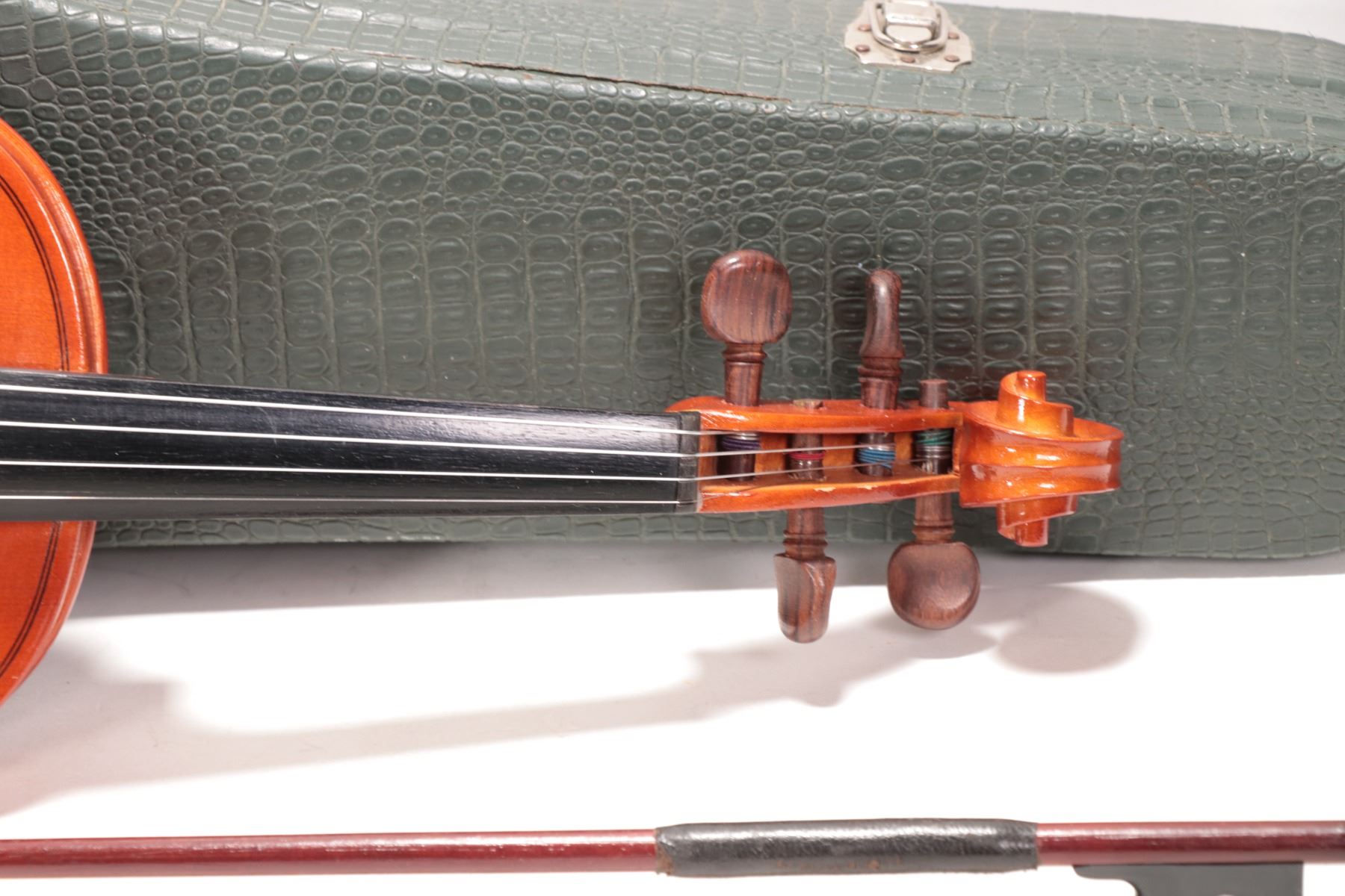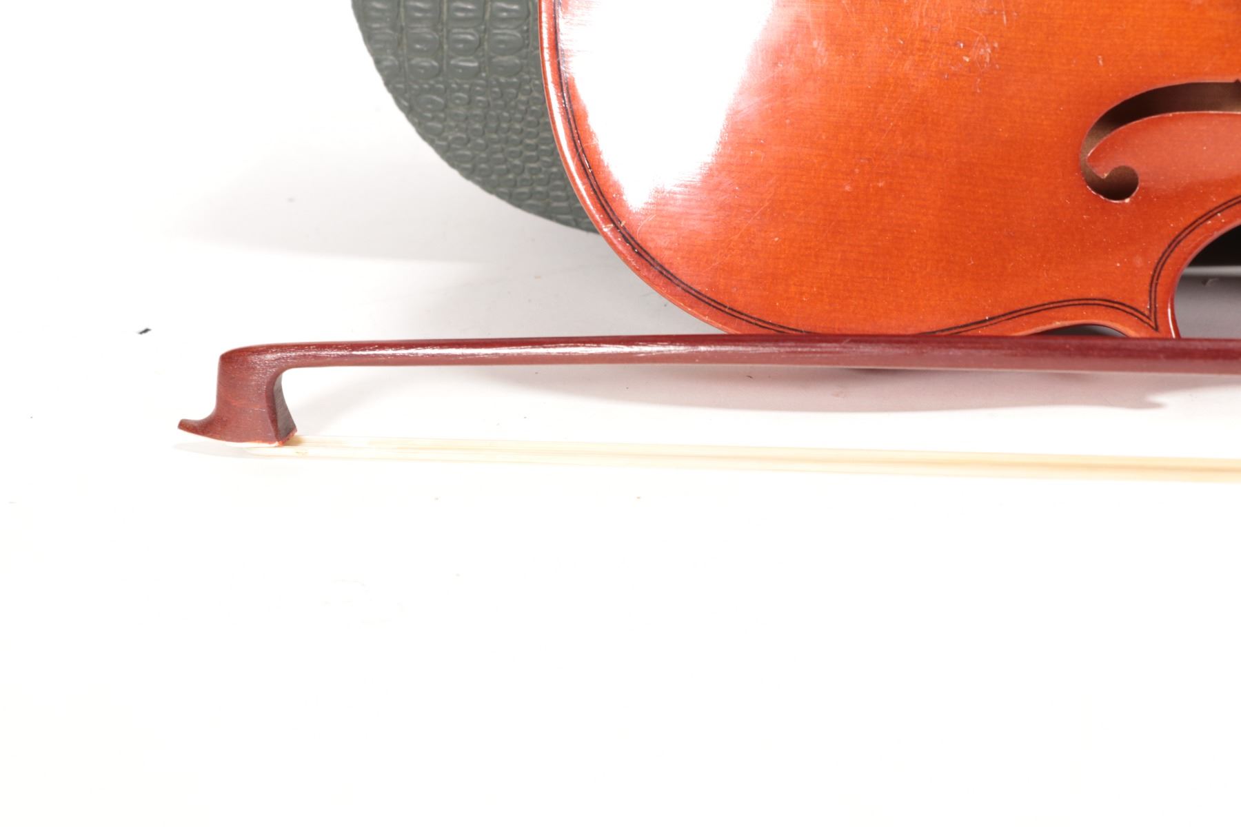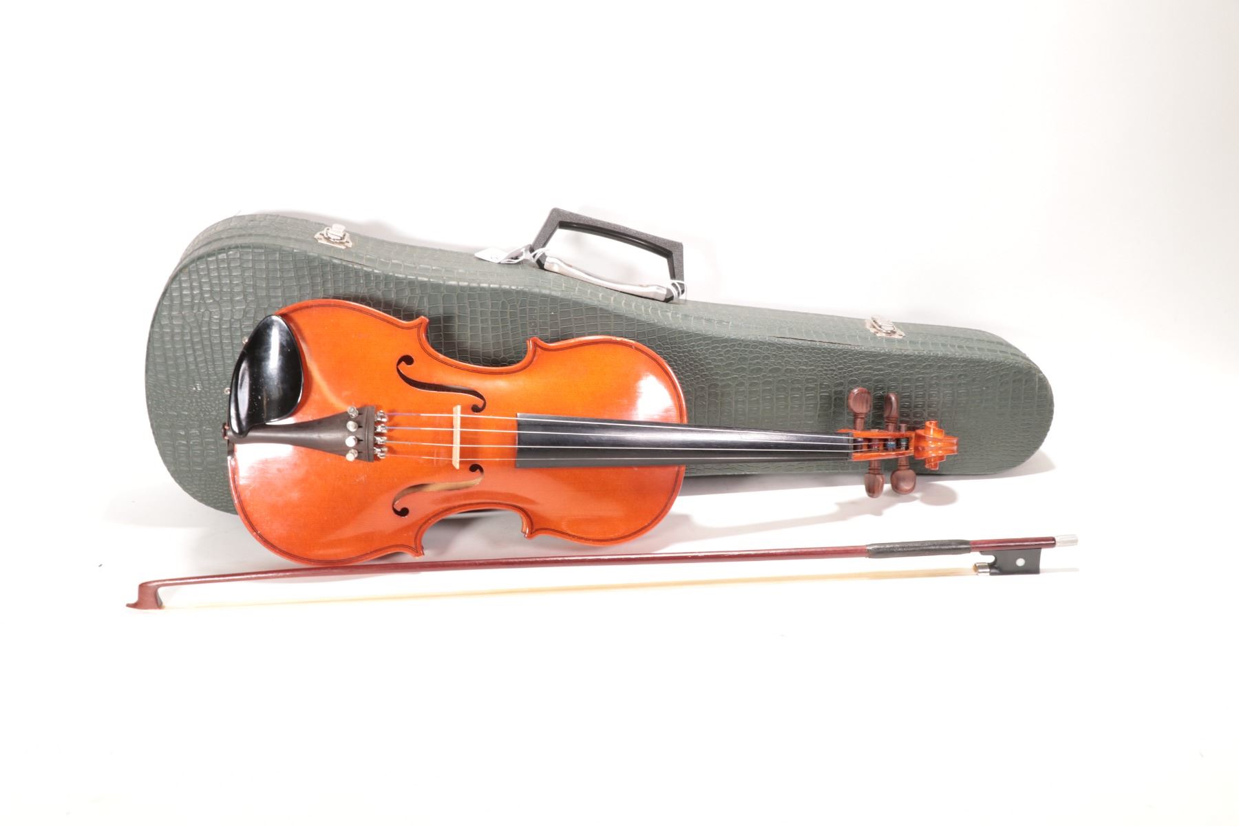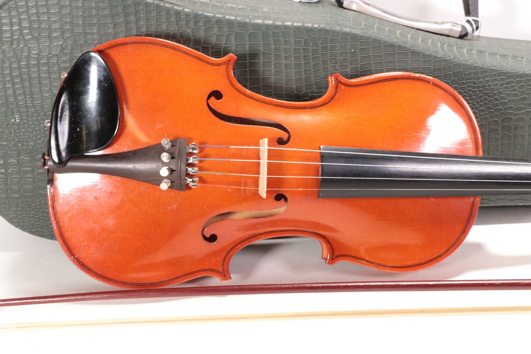 Antonius Stradivarius Cremonenfis 4/4 violin with label "Made in 1709 in Reghin, Romania". Has had recent work including the bridge set, the tail piece put together and was re strung and tuned. Includes a green faux alligator case and bow