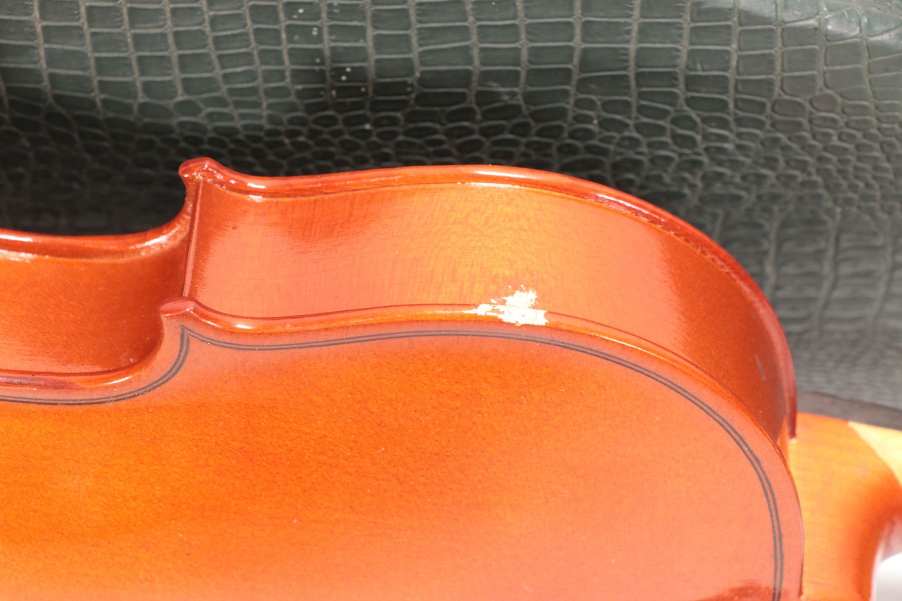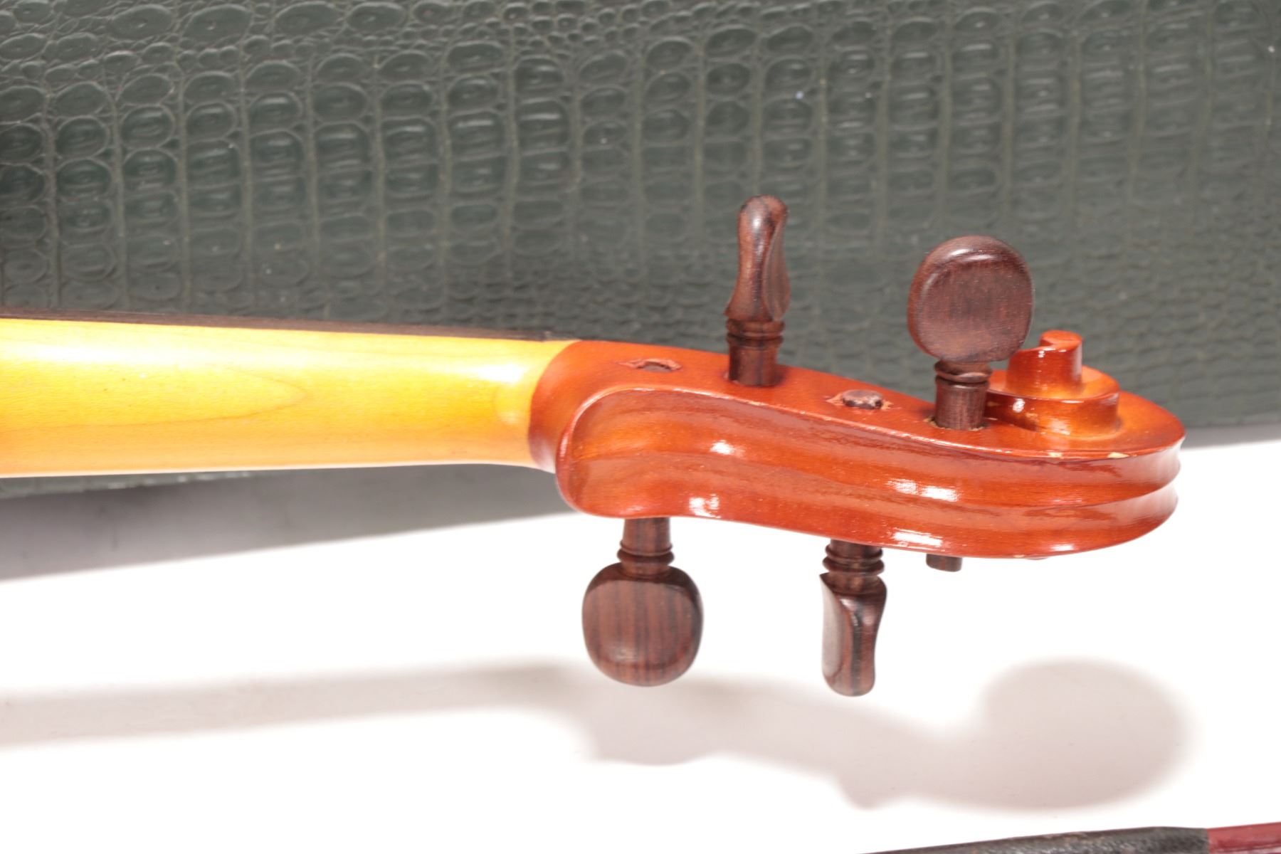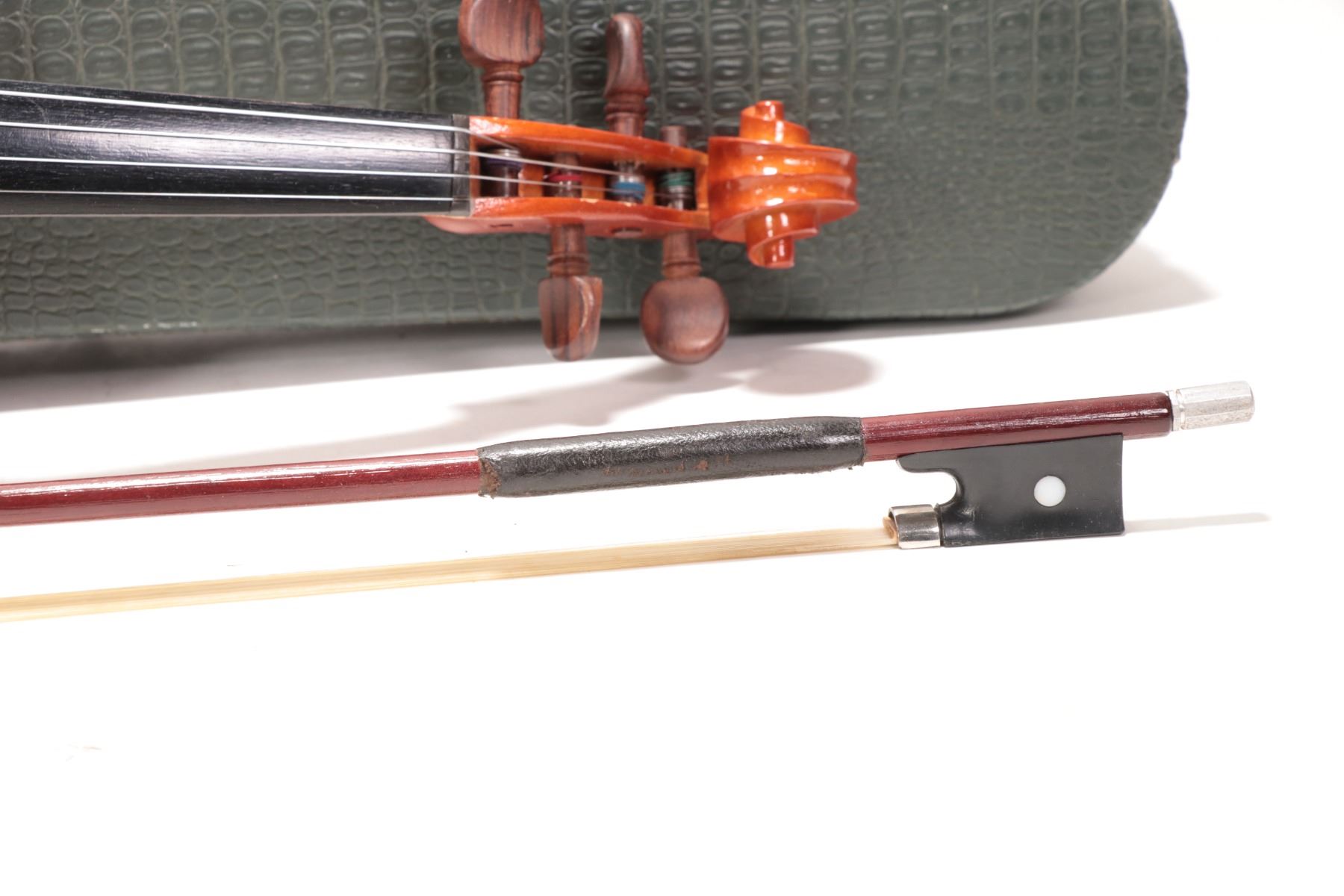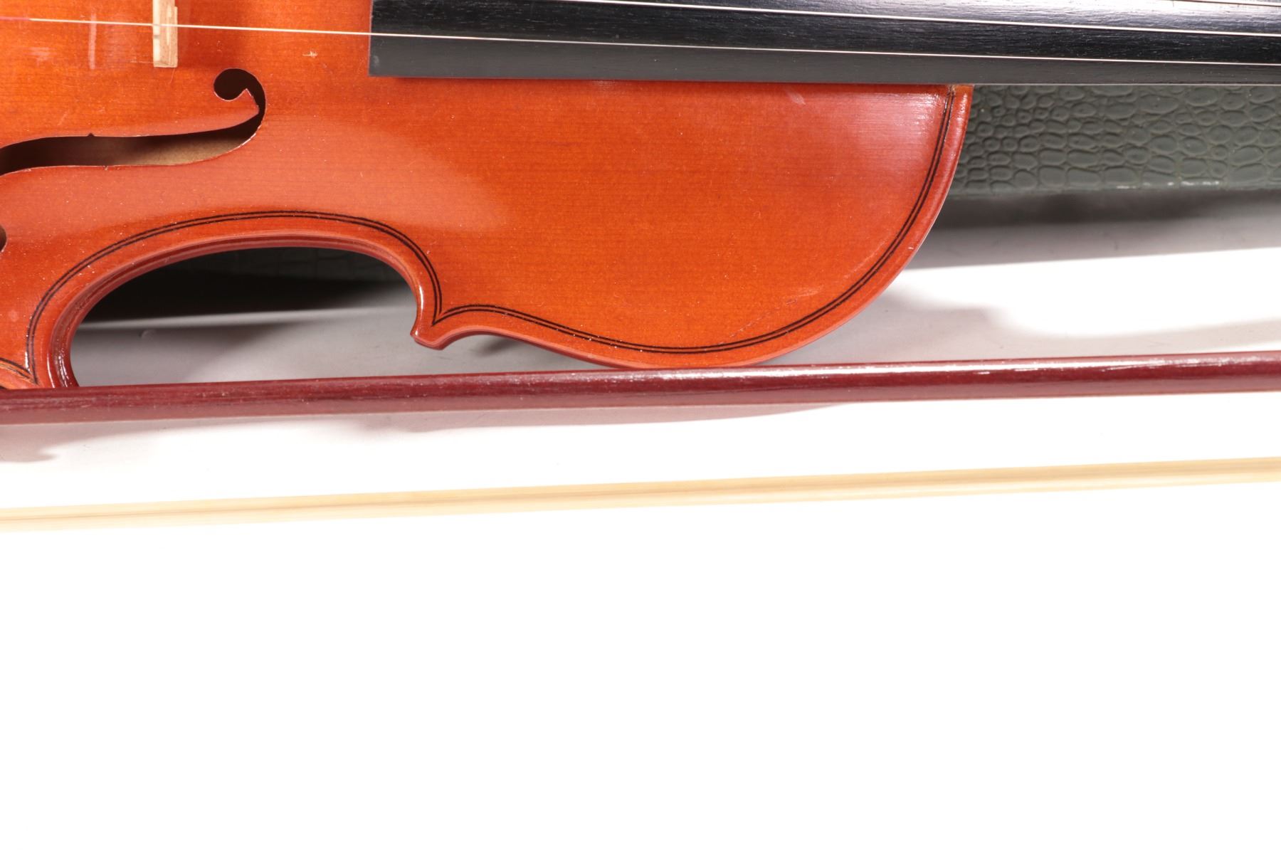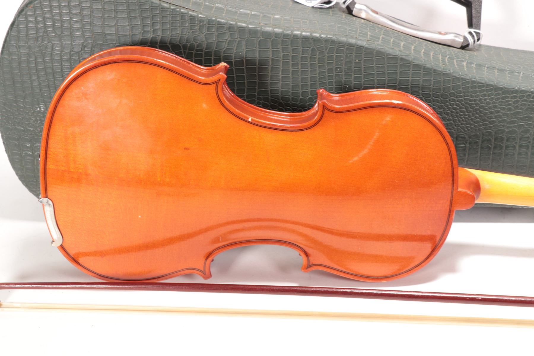 Antonius Stradivarius Cremonenfis 4/4 violin with label "Made in 1709 in Reghin, Romania". Has had recent work including the bridge set, the tail piece put together and was re strung and tuned. Includes a green faux alligator case and bow