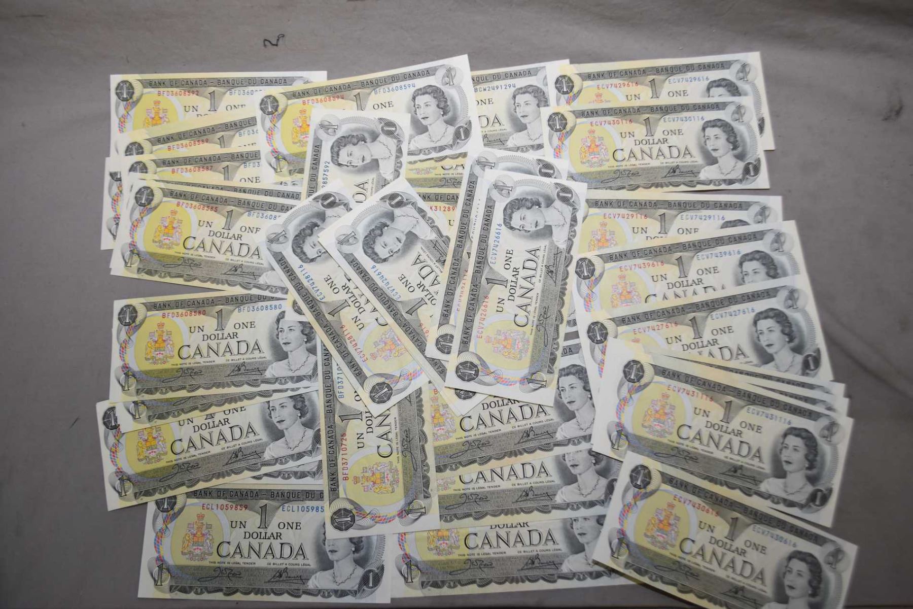 Approximately forty four 1973 Canadian $1 bills, lots of consecutive bills