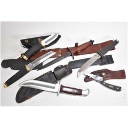 Selection of sharps including vintage Collins no. 1250 bush knife with 15" blade and leather scabba