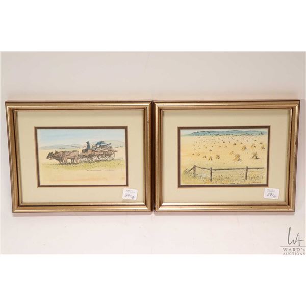 Two small framed watercolours including "The Homesteader" and "Dawson Creek, B.C." both by W.J. Adams and both 4" X 6"