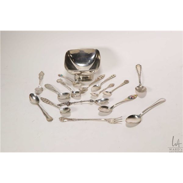 Tray of sterling silver including 4" dish with British hallmark and a selection of collector spoons