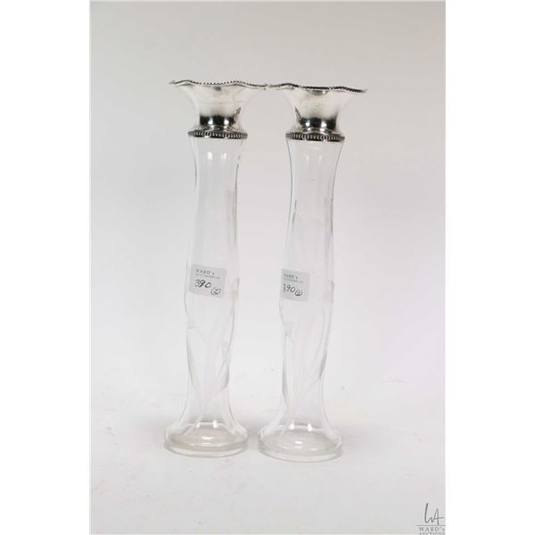 Pair of vintage/antique art nouveau bud vases with etched tulips and sterling silver beaded and fluted tops 9 1/2" in height