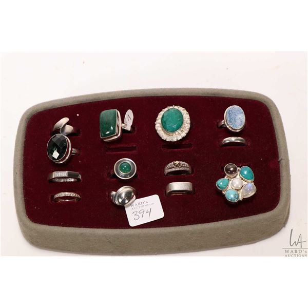 Selection of sterling silver and gemstone rings including jade, pearl, Iolite, turquoise etc.