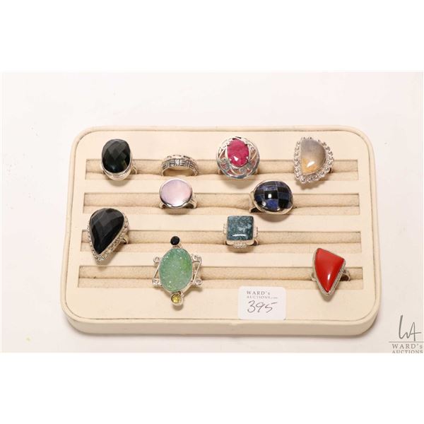 Selection of sterling silver and gemstone rings including Iolite, agate, red jasper, cherry ruby etc.