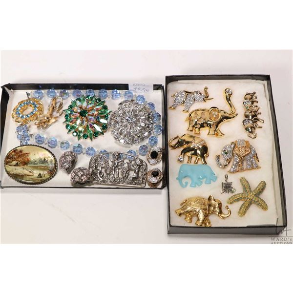 Two small trays of vintage brooches including Elephants, Starfish, diamante plus a hand painted and