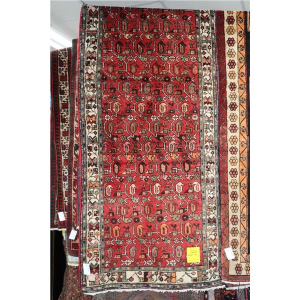 100% handmade Iranian Hamden carpet runner with overall geometric design on red background and highlights of orange, gray, cream etc. 36" X 146...