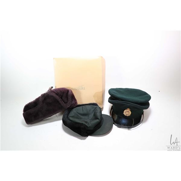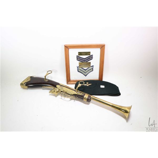 Replica blunder bust and a military cap and a framed set of sew on military patches