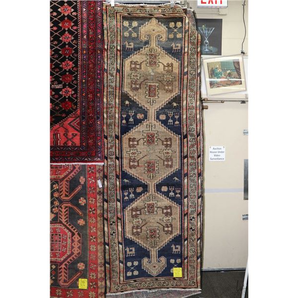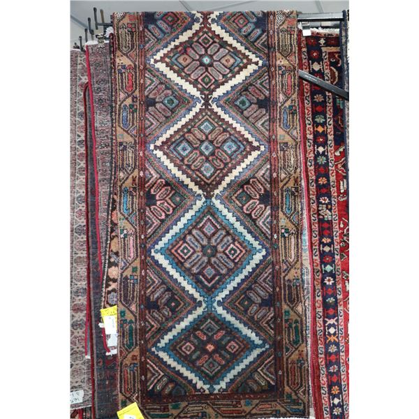 100% handmade Iranian Hamden wool carpet runner with overall geometric design and highlights of blue, green, taupe etc. 29" X 128"