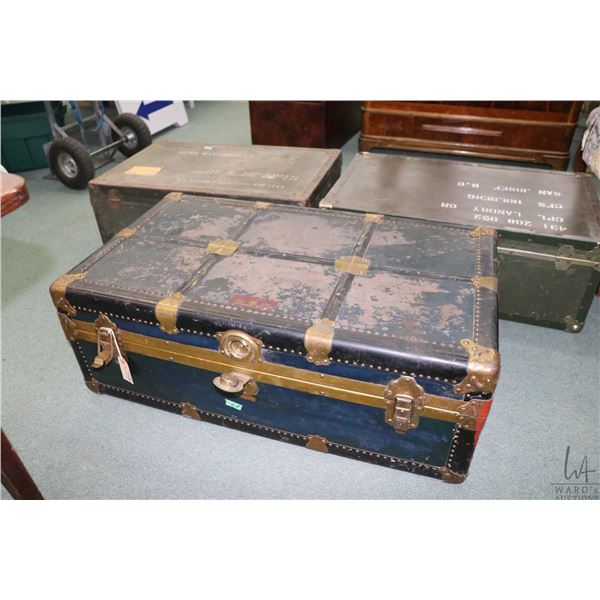Vintage blue steamer trunk with brass coloured decoration and tray 21" X 36"