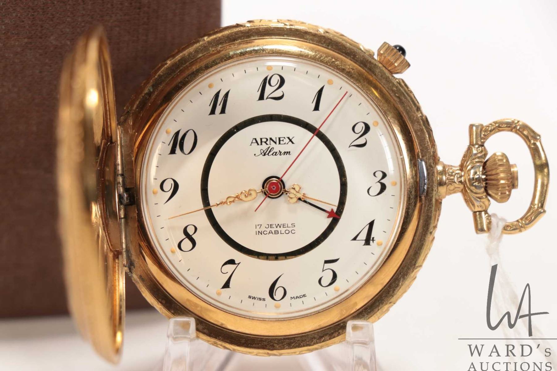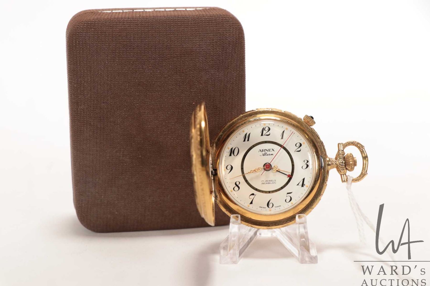 Arnex Alarm swiss made 17 jewel Incabloc pocket watch in gold filled case with white dial, Arabic nu